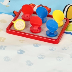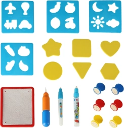 Le coffret comprend des tampons, des pochoirs, des feutres à eau et un pinceau. Les enfants apprennent les formes, les couleurs et améliorent leur motricité fine.