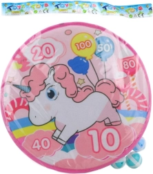 Cible ludique pour enfants avec motif licorne, d’un diamètre d’environ 35 cm, fournie avec six balles à scratch pour des lancers en toute sécurité. Idéale pour développer la motricité, la précision et la coordination œil–main chez les enfants dès 3 ans.