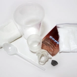Le kit contient tous les matériaux nécessaires : solution spéciale, colorant, gobelet, caillou, ficelle et d'autres composants pour une expérience réussie.