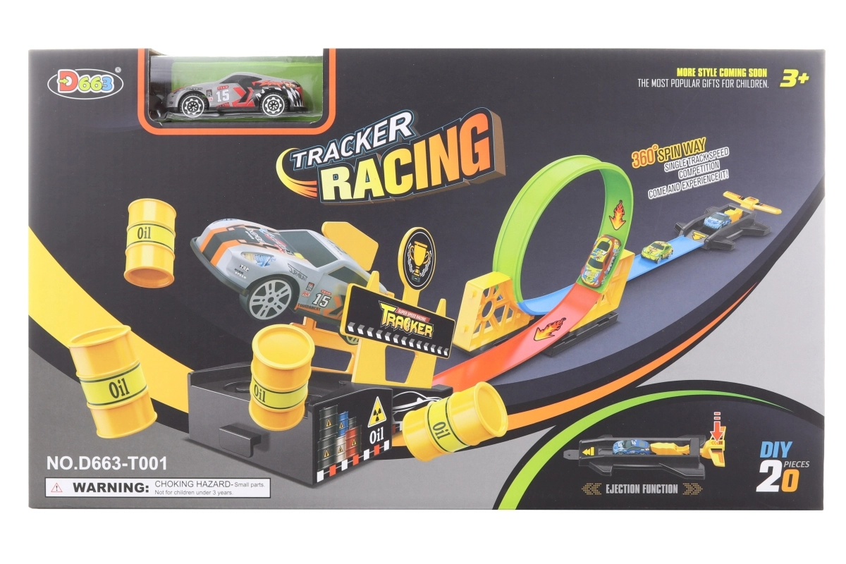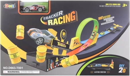 Piste de lancement avec petite voiture en métal. Longueur de la piste env. 125 cm. Dimensions de l’emballage env. 38 x 22 x 6 cm. Âge 3+.