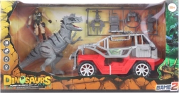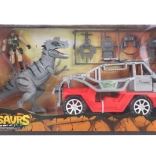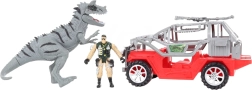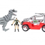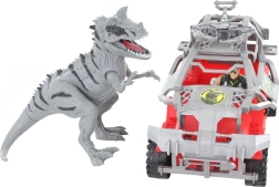 Cet ensemble comprend un dinosaure gris, une voiture tout-terrain et une figurine en tenue militaire pour une expérience de jeu ultime.
