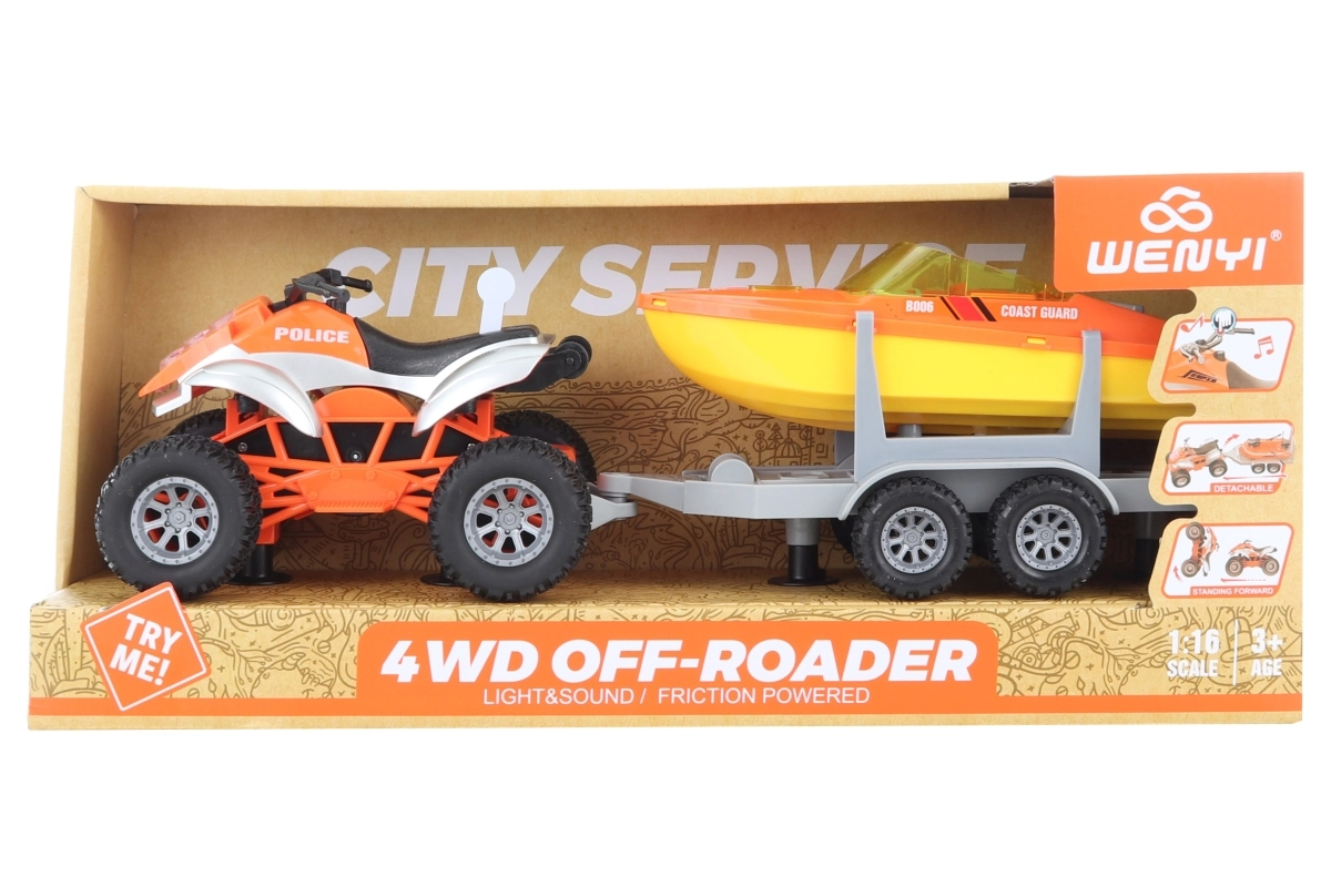 Ce quad en plastique détaillé avec remorque et bateau est un excellent choix pour les petits aventuriers. Grâce à ses effets lumineux et sonores, il paraît réaliste et favorise le jeu créatif à la maison comme en déplacement.
