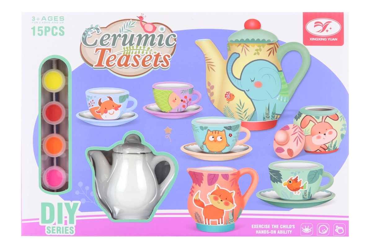 - Set complet – 4 tasses avec sous-tasses, une théière, un pot à lait, un sucrier, 6 couleurs et un pinceau.