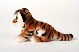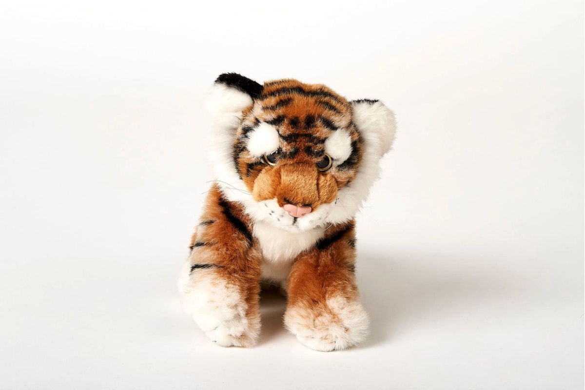 Tigre en peluche marron d’environ 25 × 19 × 11 cm (sans la queue). Longueur de la queue environ 12 cm. Âge 0+