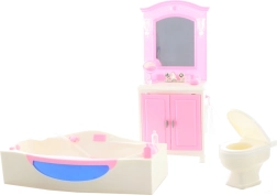 Le contenu de l’emballage inclut une coiffeuse avec lavabo, une baignoire et des toilettes, ainsi que de petits accessoires qui recréent l’ambiance d’une véritable salle de bain. La fabrication en plastique garantit un entretien facile et une longue durabilité lors d’un usage quotidien.