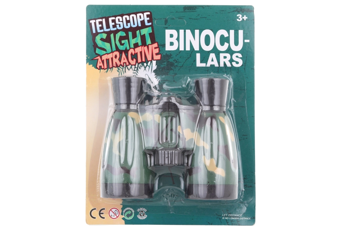 Jumelles en plastique camouflage d’environ 13,5 x 12 x 5 cm. Dimensions de l’emballage : environ 17 x 22 x 5,5 cm. Âge 3+.