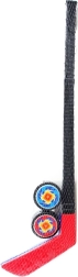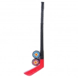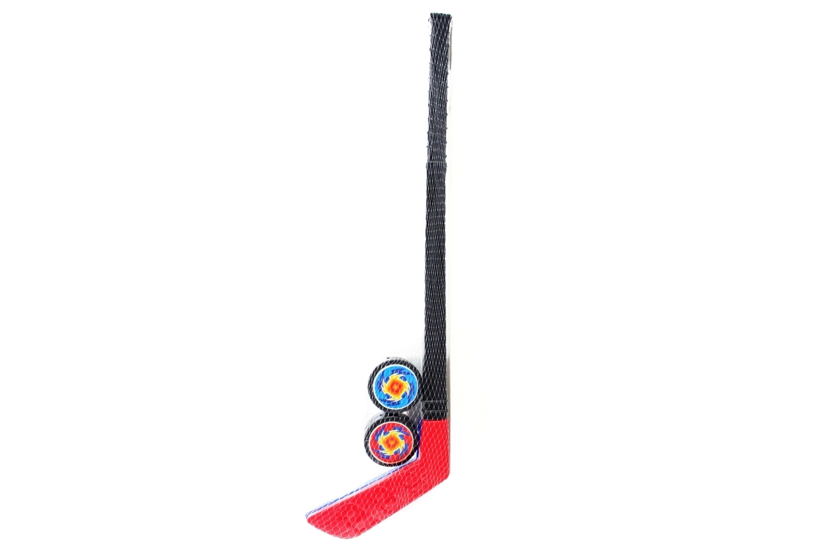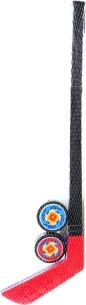 Deux crosses de hockey en plastique dans un filet d’environ 57 cm de long, chacune d’une couleur différente, et 2 palets. Âge 3+