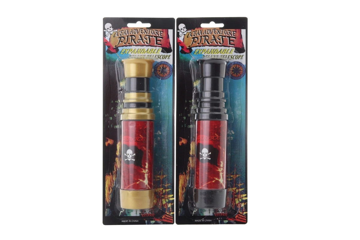 Une élégante longue-vue de pirate pour enfants avec motif tête de mort et os croisés, un accessoire parfait pour tous les petits aventuriers. Sa conception en plastique léger, son système télescopique facile et ses dimensions compactes en font un jouet idéal pour les voyages comme pour les jeux à la maison. Plastique léger, structure télescopique et design pirate pour des aventures sans fin.