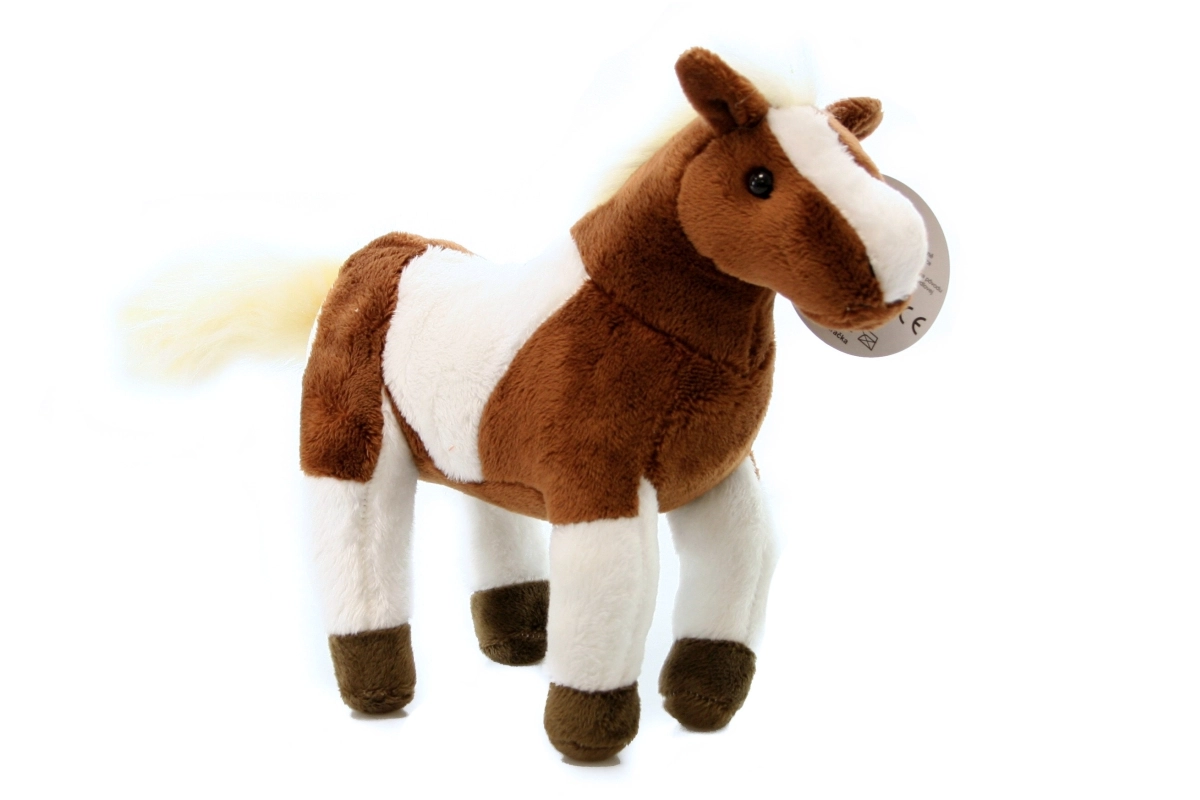 Adorable cheval en peluche brun et blanc au motif tacheté et à la crinière blanche, qui ravira les petits comme les grands amoureux des animaux. Tout doux, en position debout, et adapté dès la naissance. Idéal pour jouer et câliner, superbe cadeau pour la chambre d’enfant. Peluche douce, format debout, sûr dès 0+, taille compacte 23 cm.
