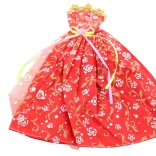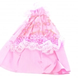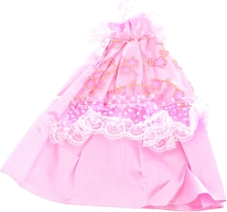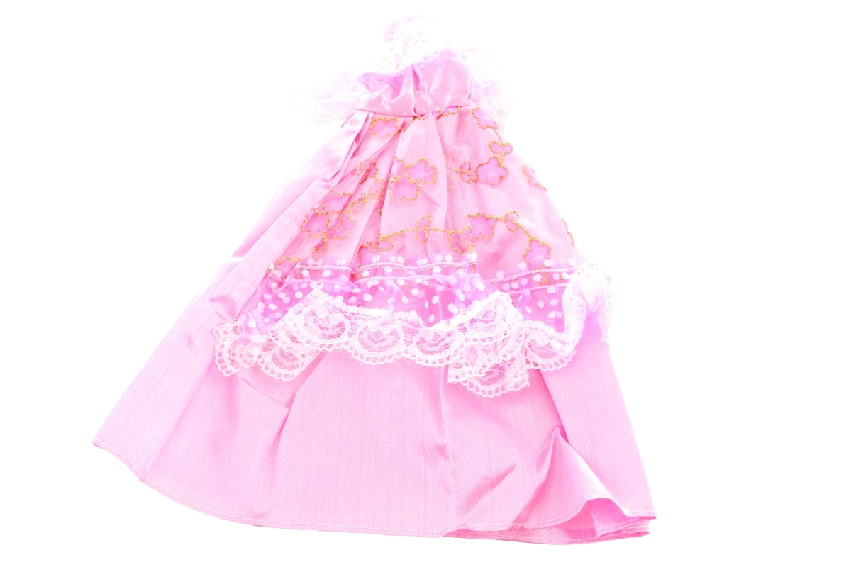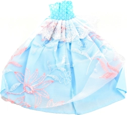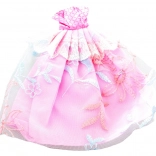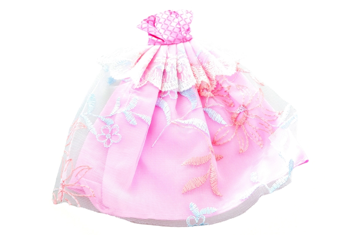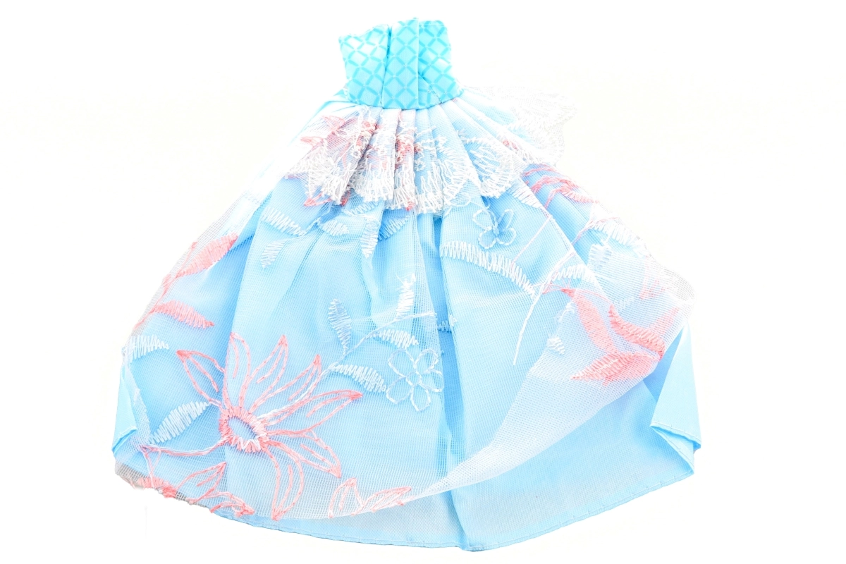 La dentelle, les paillettes et les motifs floraux donnent à la poupée une allure festive.