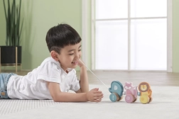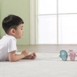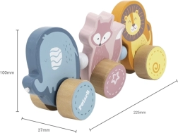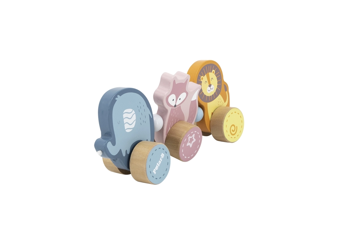 L’éléphant, le renard et le lion reliés en un petit convoi stimulent l’imagination et invitent au jeu créatif.