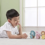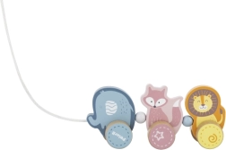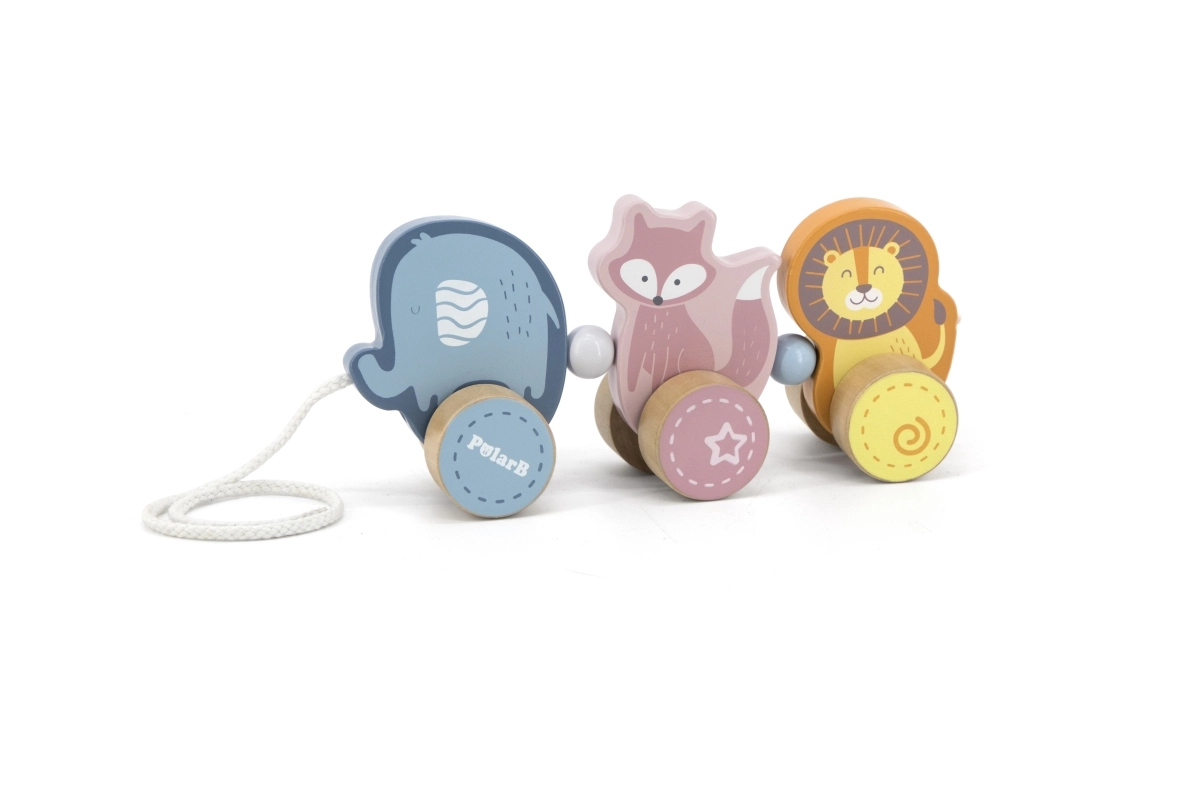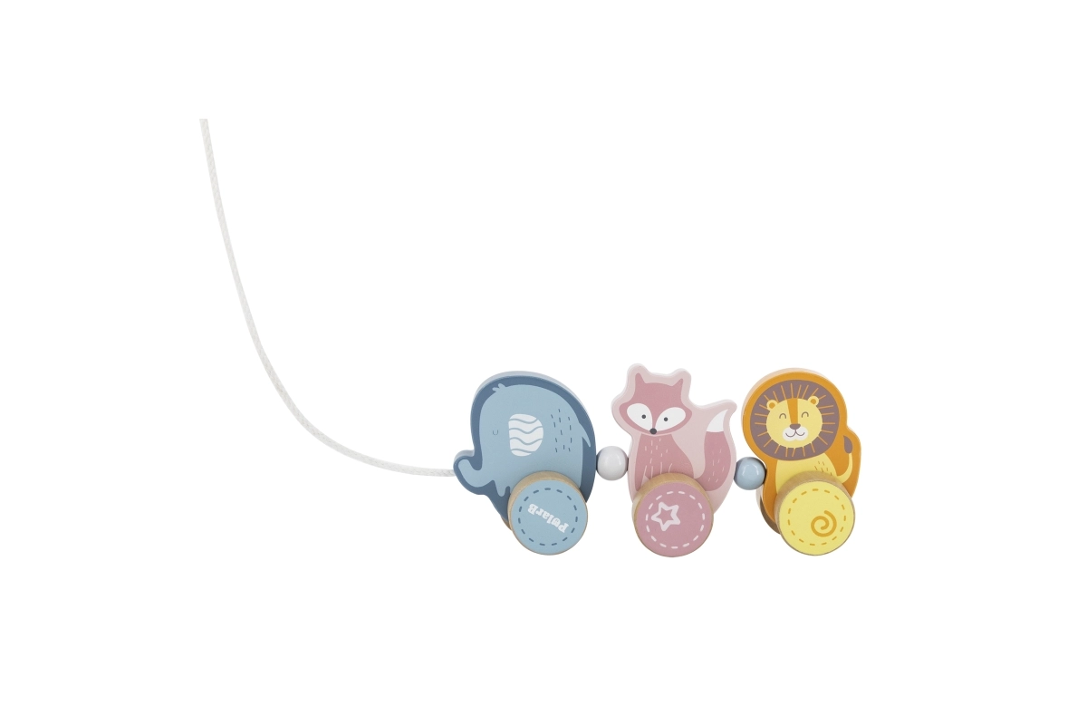 Ce jouet à tirer en bois de haute qualité, dans de doux tons pastels, est conçu pour les tout-petits qui apprennent à marcher et à découvrir le monde. Trois adorables animaux – éléphant, renard et lion – sont reliés et roulent en douceur sur des roues en bois. Grâce à la corde de traction solide, les jouets se dirigent facilement, motivent les enfants à bouger et développent naturellement l’équilibre et la coordination.