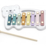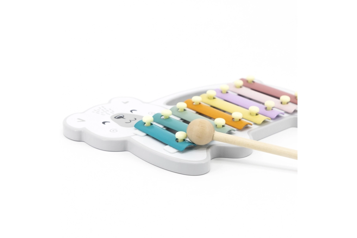 Le xylophone en bois en forme d’ours polaire allie une esthétique ludique à un instrument de musique fonctionnel. Les lames métalliques aux couleurs pastel produisent des sons agréables lorsqu’on les frappe avec la mailloche en bois, incitant naturellement les enfants à expérimenter les sons et le rythme.