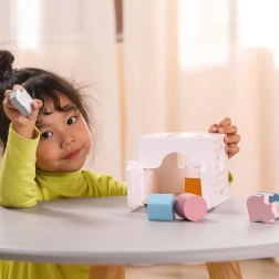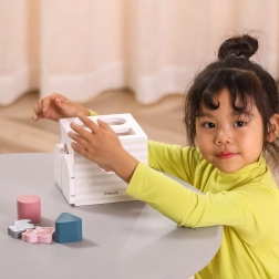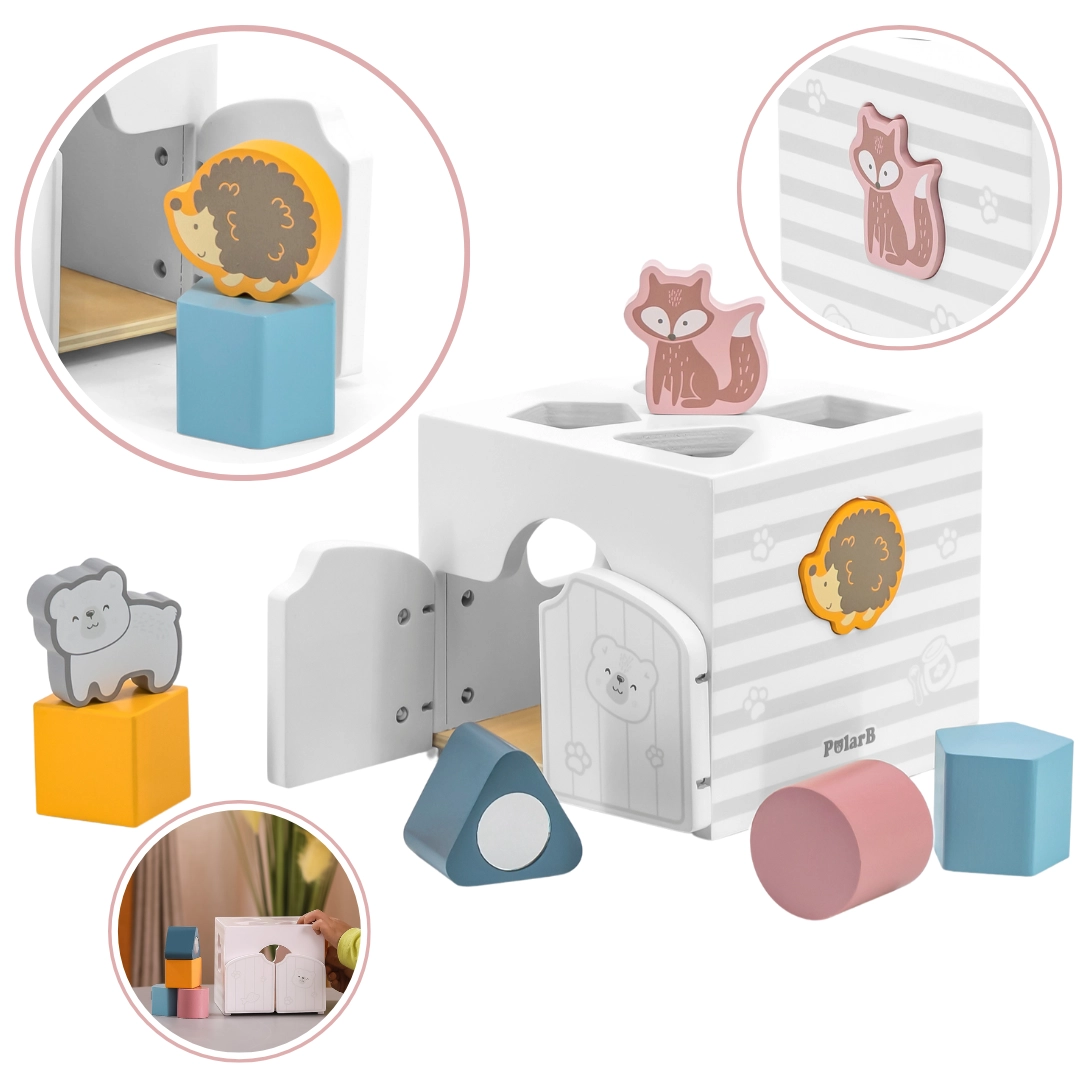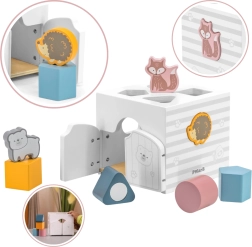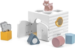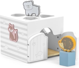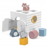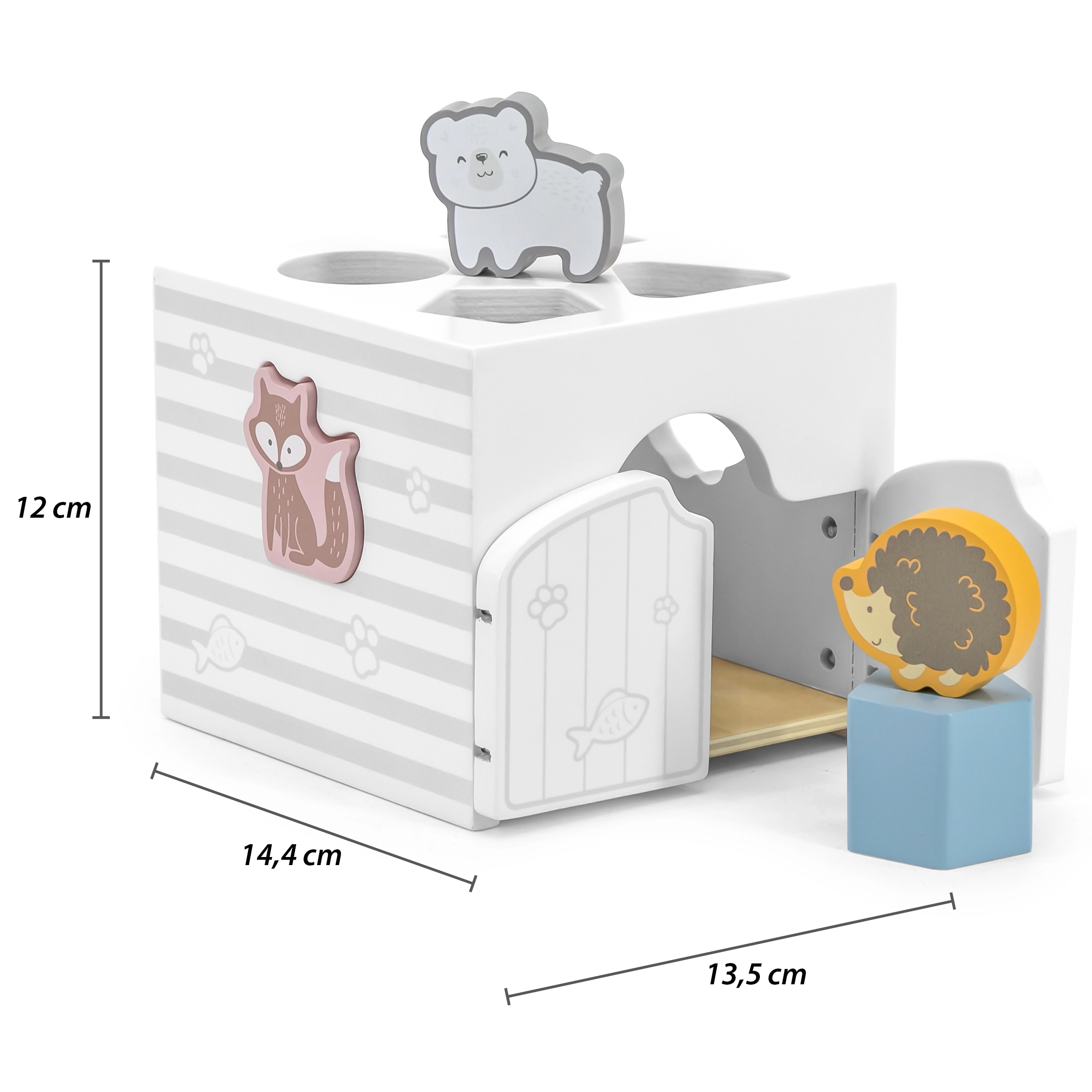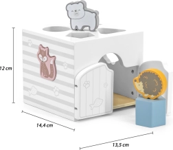 Boîte d’encastrement en bois avec animaux. Les blocs font du bruit (hochet). Dimensions de la boîte env. 13,5 × 12 × 14,4 cm. Dimensions de l’emballage env. 15 × 14,5 × 13 cm. Âge 18 mois et +