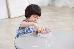 Les dés colorés et les bougies favorisent la reconnaissance des chiffres, le comptage des parts et les premiers jeux mathématiques.