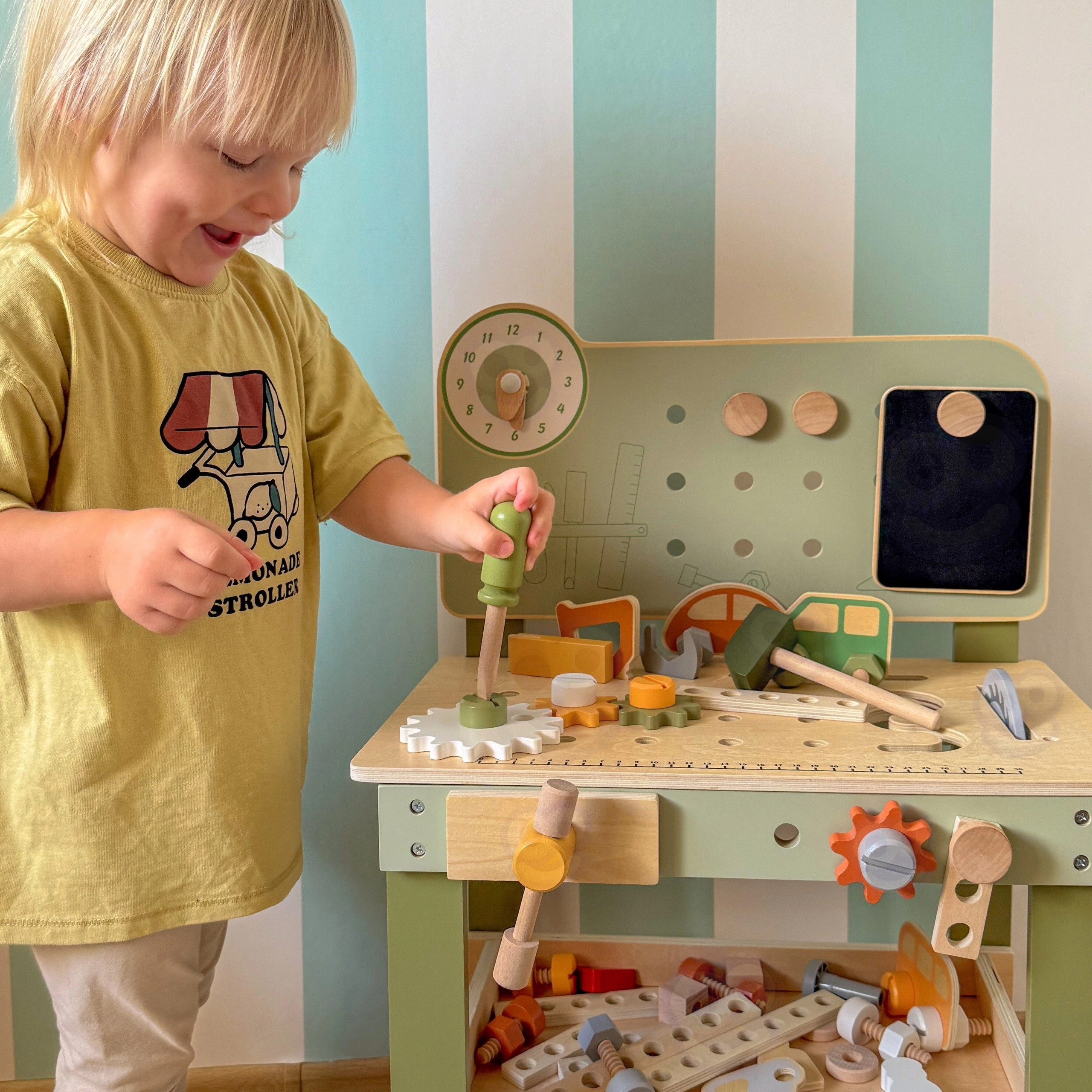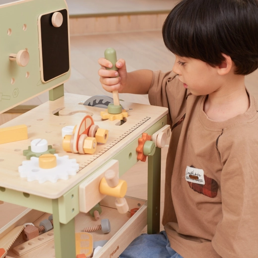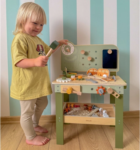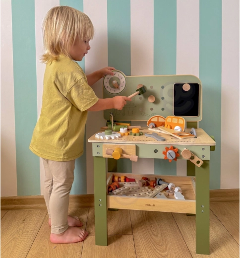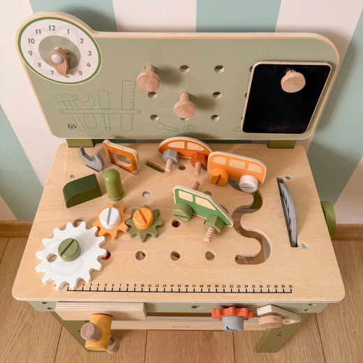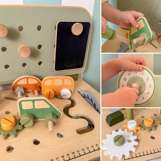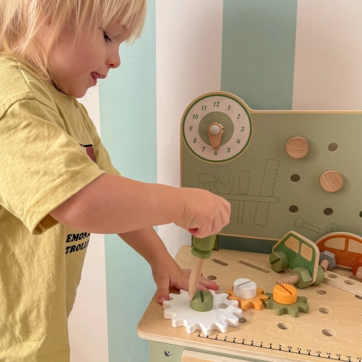 L’établi avec panneau perforé, échelle de mesure et éléments rotatifs favorise un jeu réaliste et le développement des compétences liées à l’utilisation d’outils.