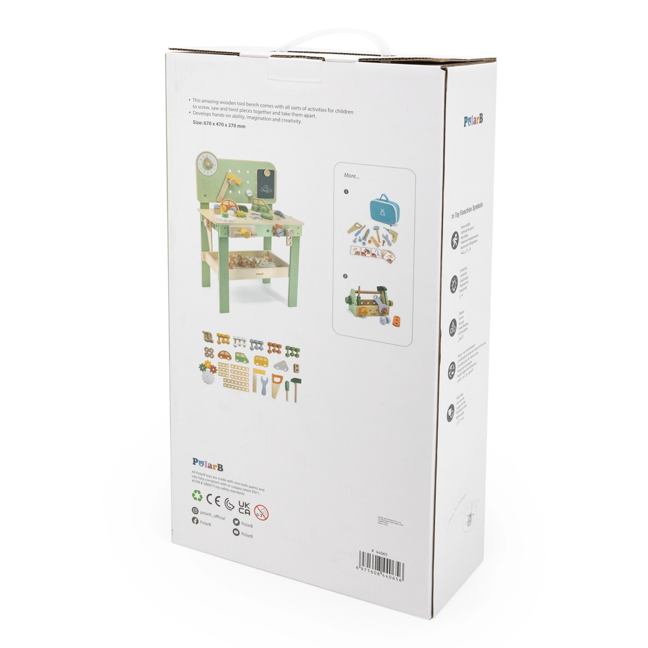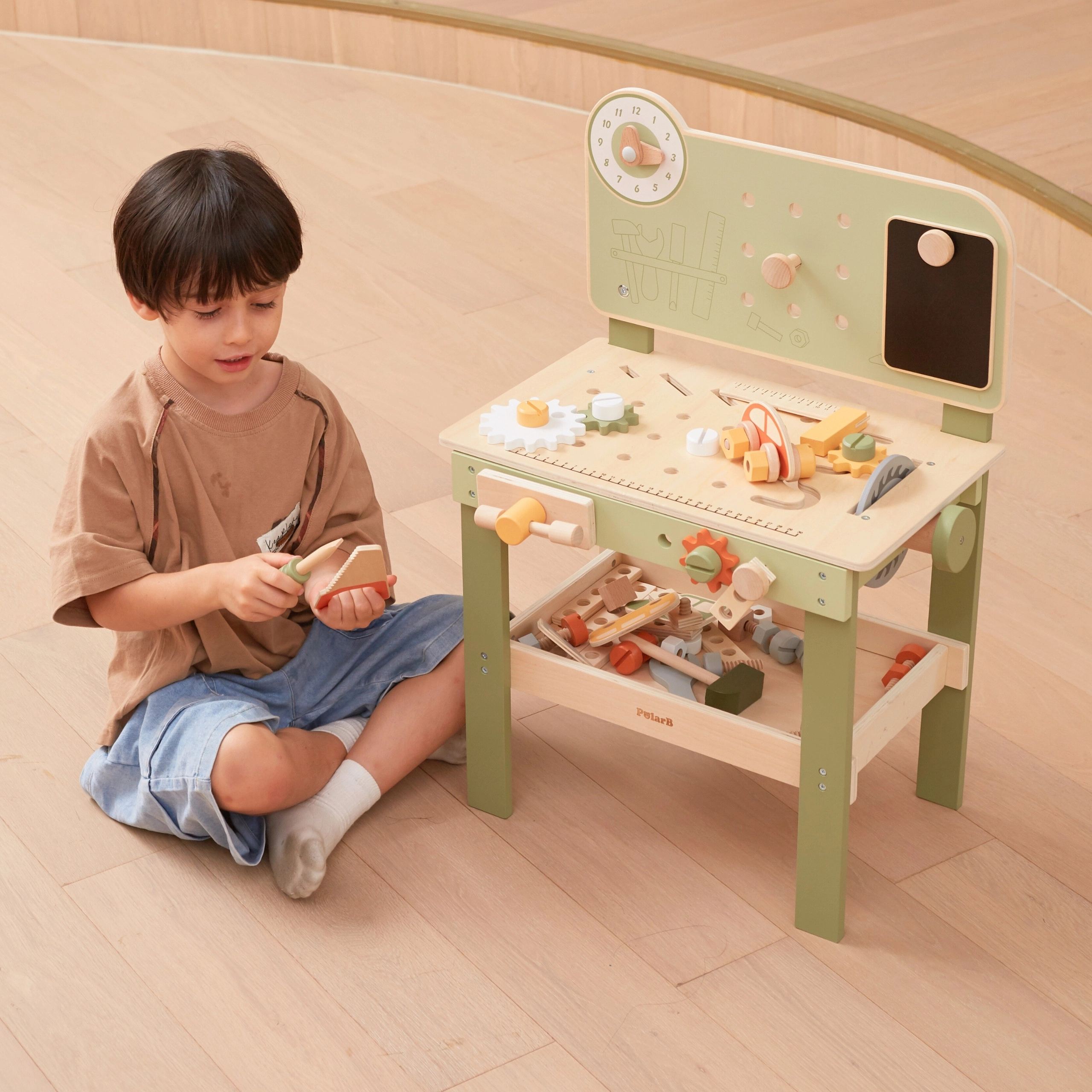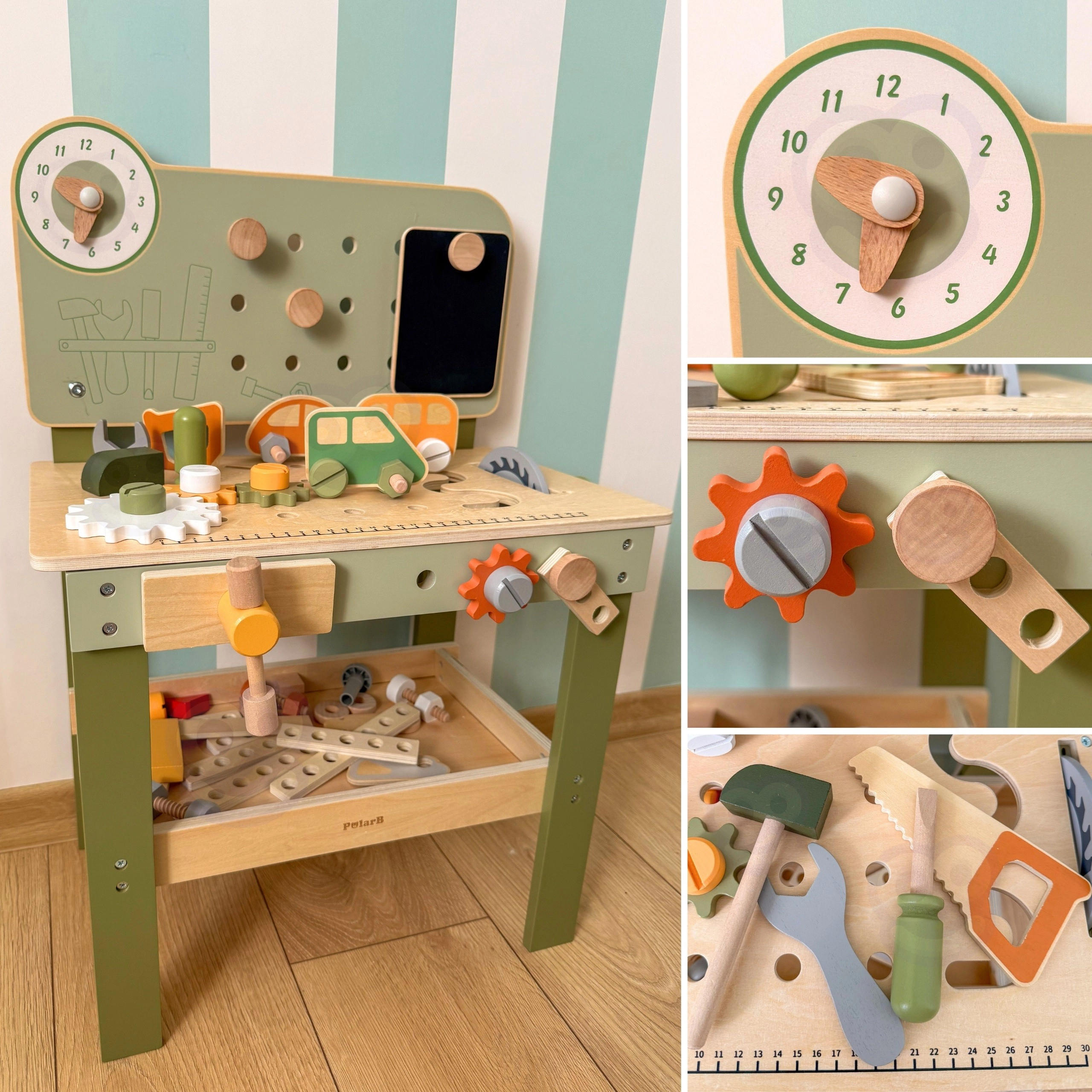 Découvrez l’établi Viga PolarB, robuste et stylé, conçu pour les petits bricoleurs dès 3 ans. Grâce à sa structure en bois, à ses engrenages qui tournent en douceur et à son large éventail d’accessoires, les enfants entraînent la coordination œil‑main et apprennent à résoudre des tâches en jouant. Des matériaux sûrs et des détails bien pensés assurent une longue durée de vie et un rangement pratique des composants.