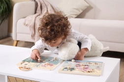 Les illustrations sur la planche indiquent le bon emplacement des pièces. Les enfants s’exercent naturellement à reconnaître les formes, les couleurs et les animaux.