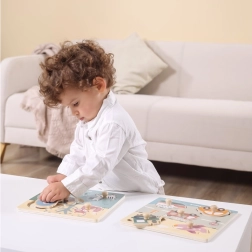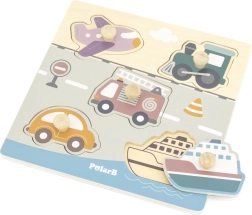 Puzzle en bois à encastrer avec motif de moyens de transport. Dimensions de la planche en bois env. 22 x 22 cm. Dimensions de l’emballage env. 22 x 22 x 2,5 cm. Âge 18 mois et plus