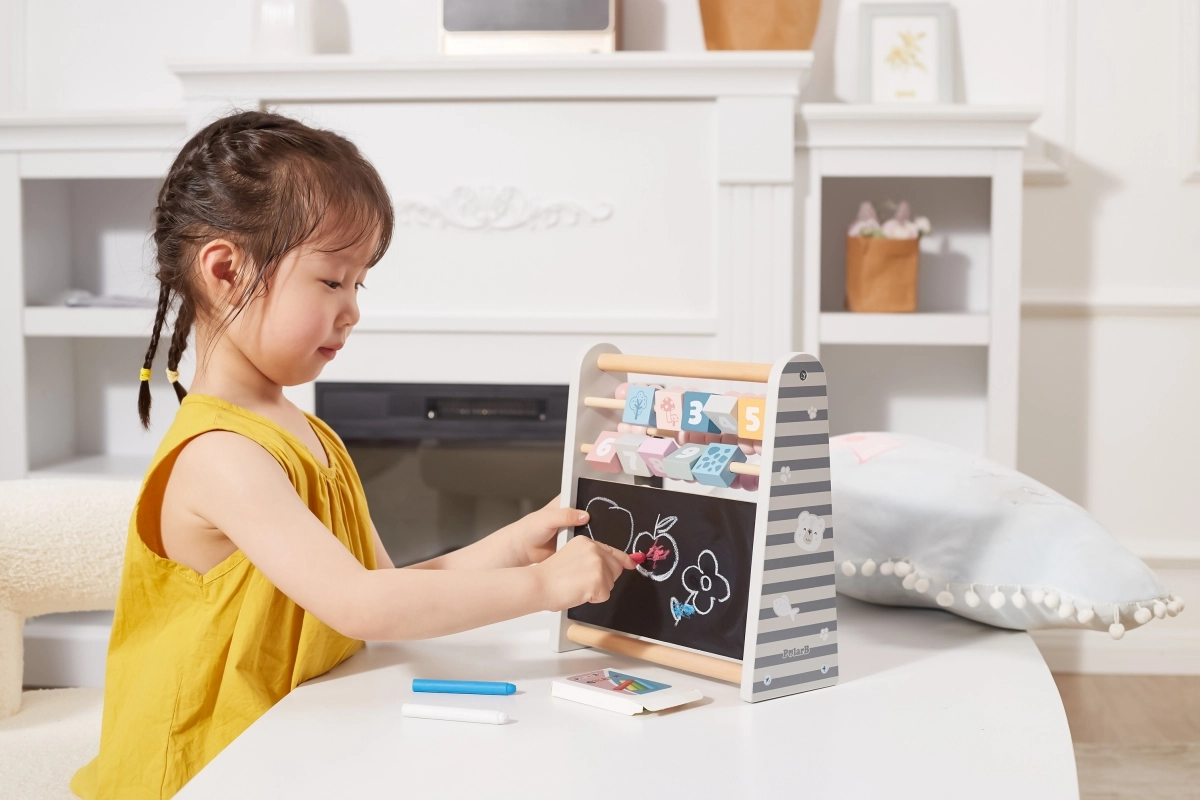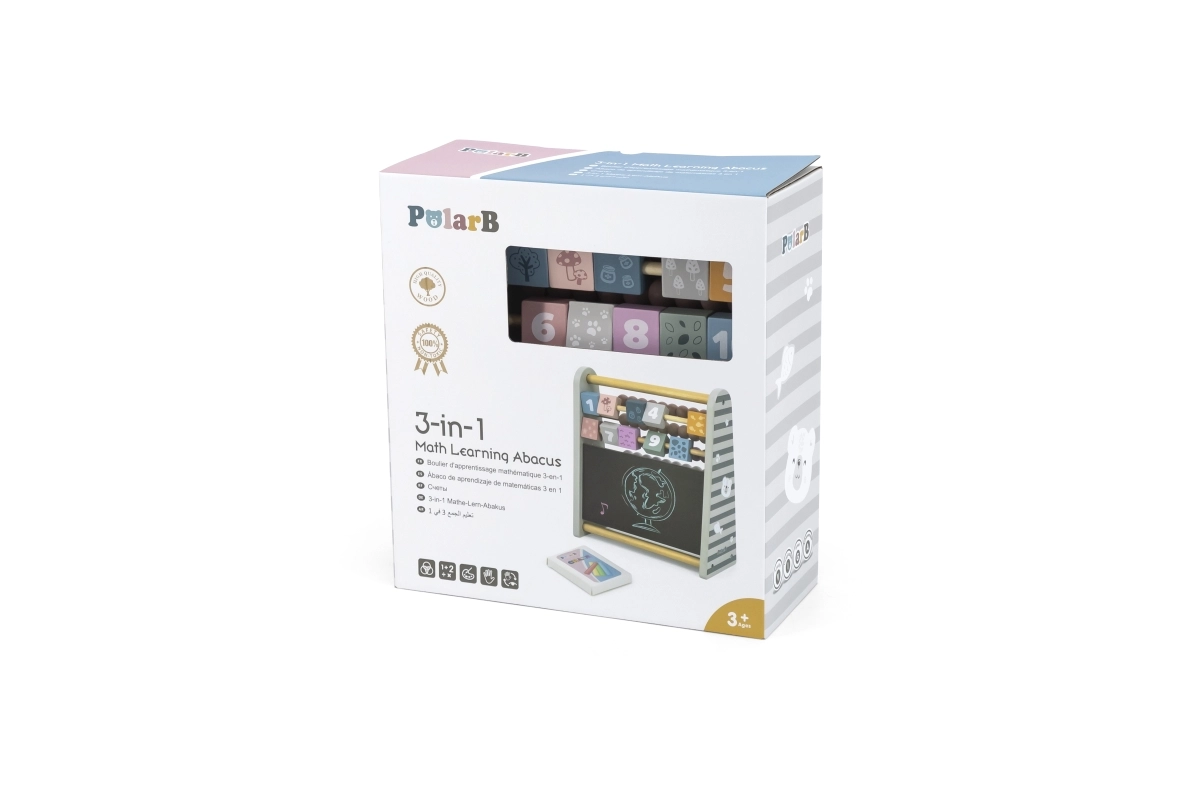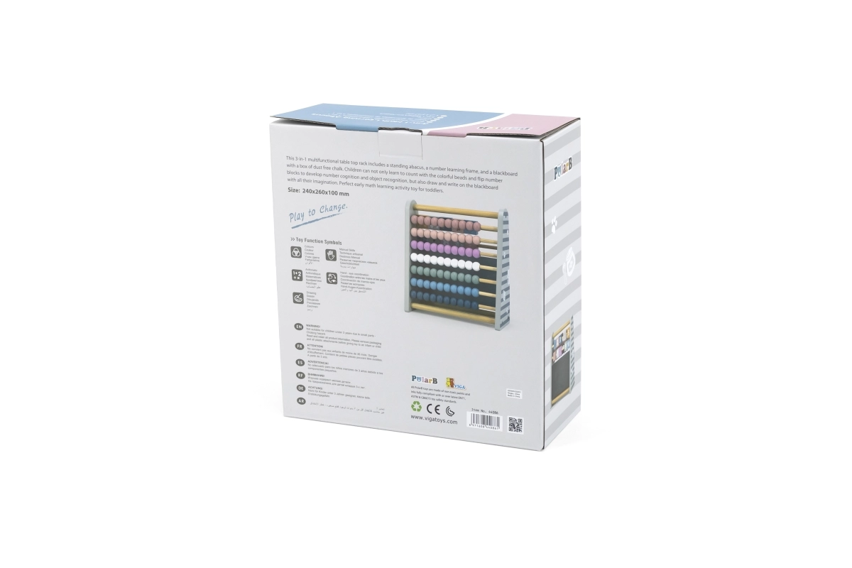 Ce abacus multifonction 3‑en‑1 réunit apprentissage et jeu. Grâce aux perles colorées, les enfants s’exercent au calcul ; avec les cubes basculants numérotés, ils apprennent à reconnaître les chiffres et les relations simples ; et sur l’ardoise à craie, ils peuvent écrire ou dessiner leurs premiers exercices et illustrations.
