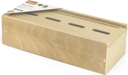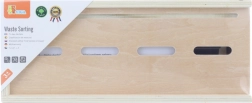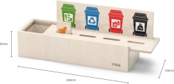 Le jouet apprend aux enfants à bien trier les déchets à l’aide de plaquettes en bois ludiques et de poubelles codées par couleur.