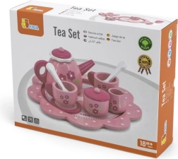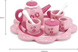 L'ensemble contient tout ce qu'il faut pour jouer aux goûters : théière, pot à lait, sucrier, tasses, soucoupes, cuillères et plateau.