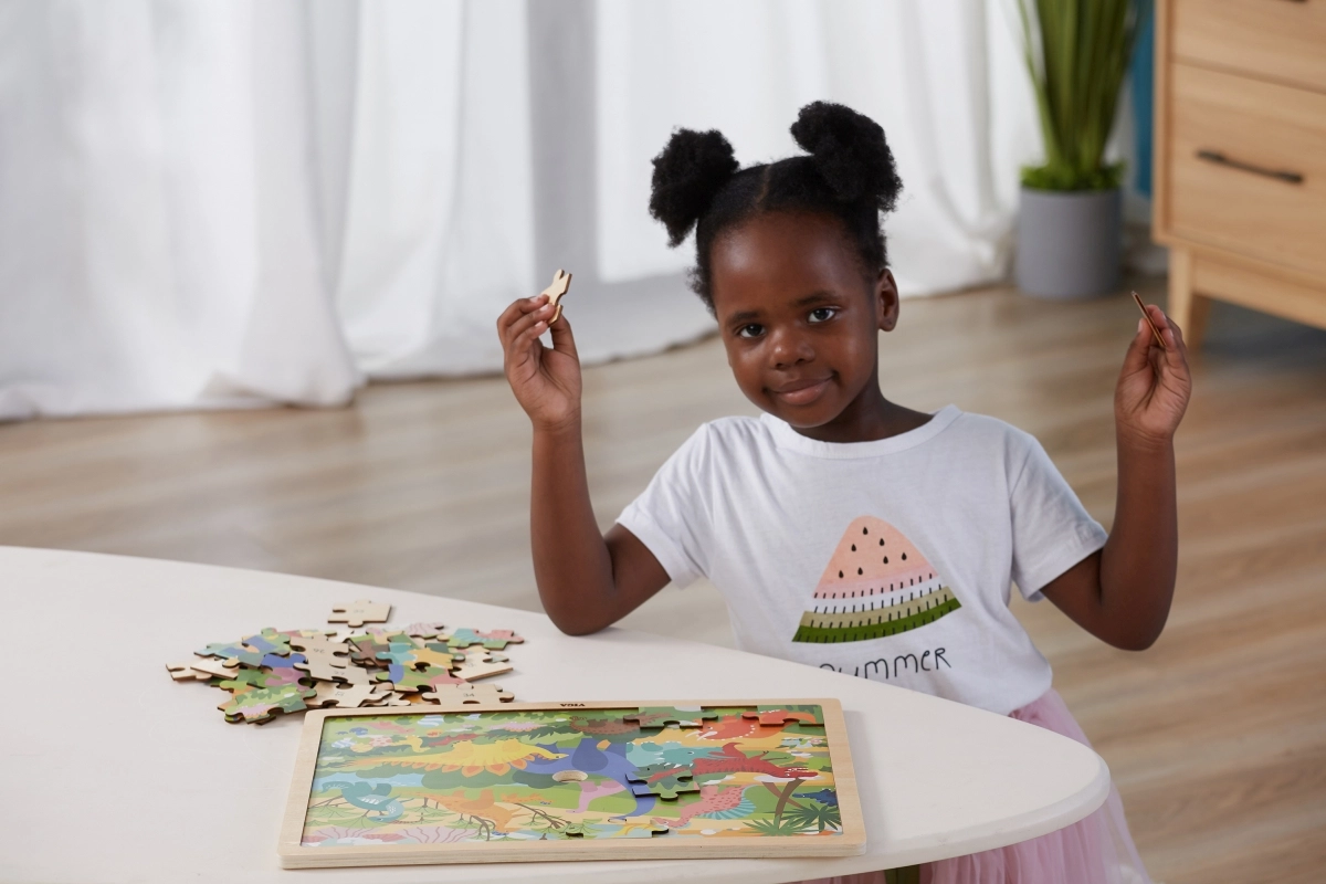 Le plateau en bois solide maintient les pièces en place, facilite le transport et le rangement, et aide les enfants à se concentrer sur l’assemblage de l’image.