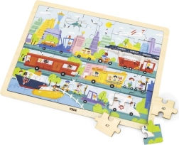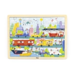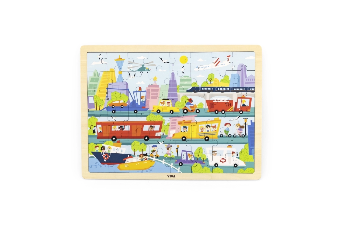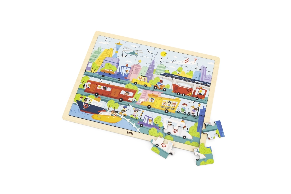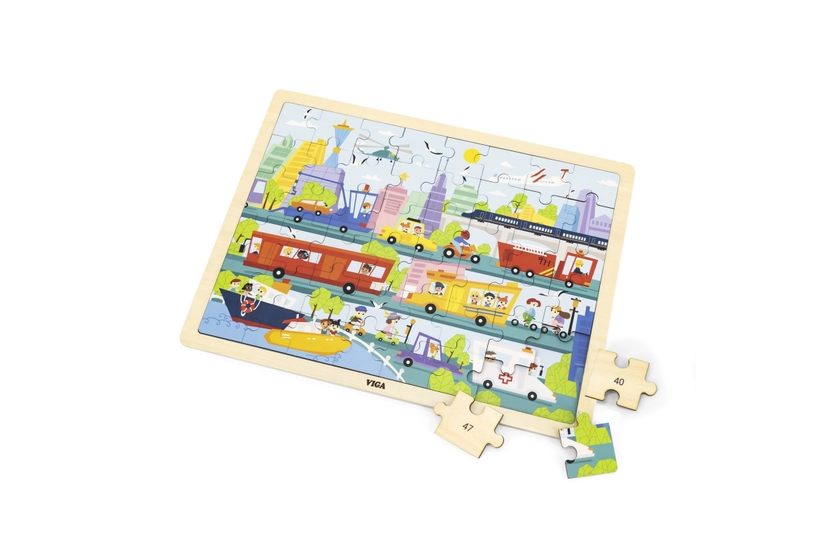 Ce puzzle en bois de qualité, représentant une scène urbaine riche et des moyens de transport variés, ravira les petits explorateurs. Grâce à ses 48 pièces et à son cadre solide, les enfants exercent leur concentration, leur coordination œil–main et leur patience. Des couleurs éclatantes et des illustrations claires les motivent à répéter l’assemblage.