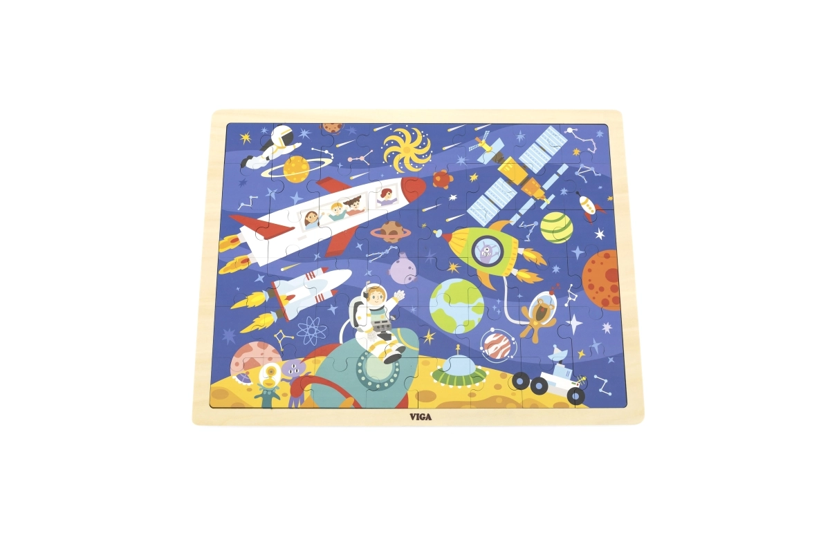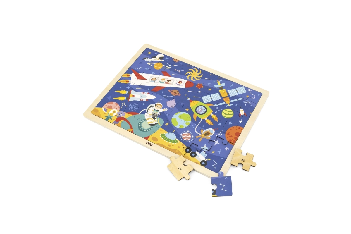 Ce puzzle en bois de qualité avec 48 pièces offre aux enfants une aventure captivante dans l’espace. Les illustrations colorées de planètes, de fusées et d’astronautes retiennent l’attention et stimulent la curiosité naturelle. Le puzzle est inséré dans un cadre en bois solide qui facilite l’assemblage et le transport.