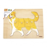 Premier puzzle pour enfants dès 18 mois : puzzle d’insertion Montessori en bois avec motif de chien de VIGA. Grâce aux poignées, les pièces se tiennent facilement, développent la motricité fine, la coordination œil–main et la pensée logique. Bois robuste et peintures sûres. Taille du plateau 30 × 22,5 cm.
