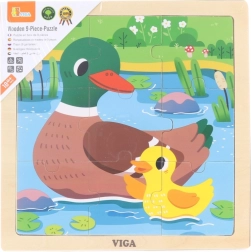 Le puzzle en bois pour enfants représentant une cane et un caneton offre un apprentissage ludique par le jeu. Neuf pièces robustes s’insèrent dans un cadre en bois pour former une joyeuse scène d’étang. Des couleurs vives, un matériau résistant et la forme étudiée des pièces facilitent la manipulation et les premières réussites.