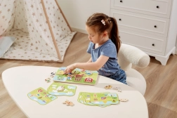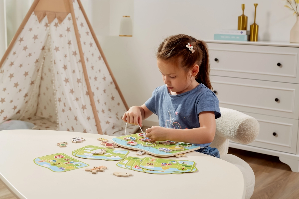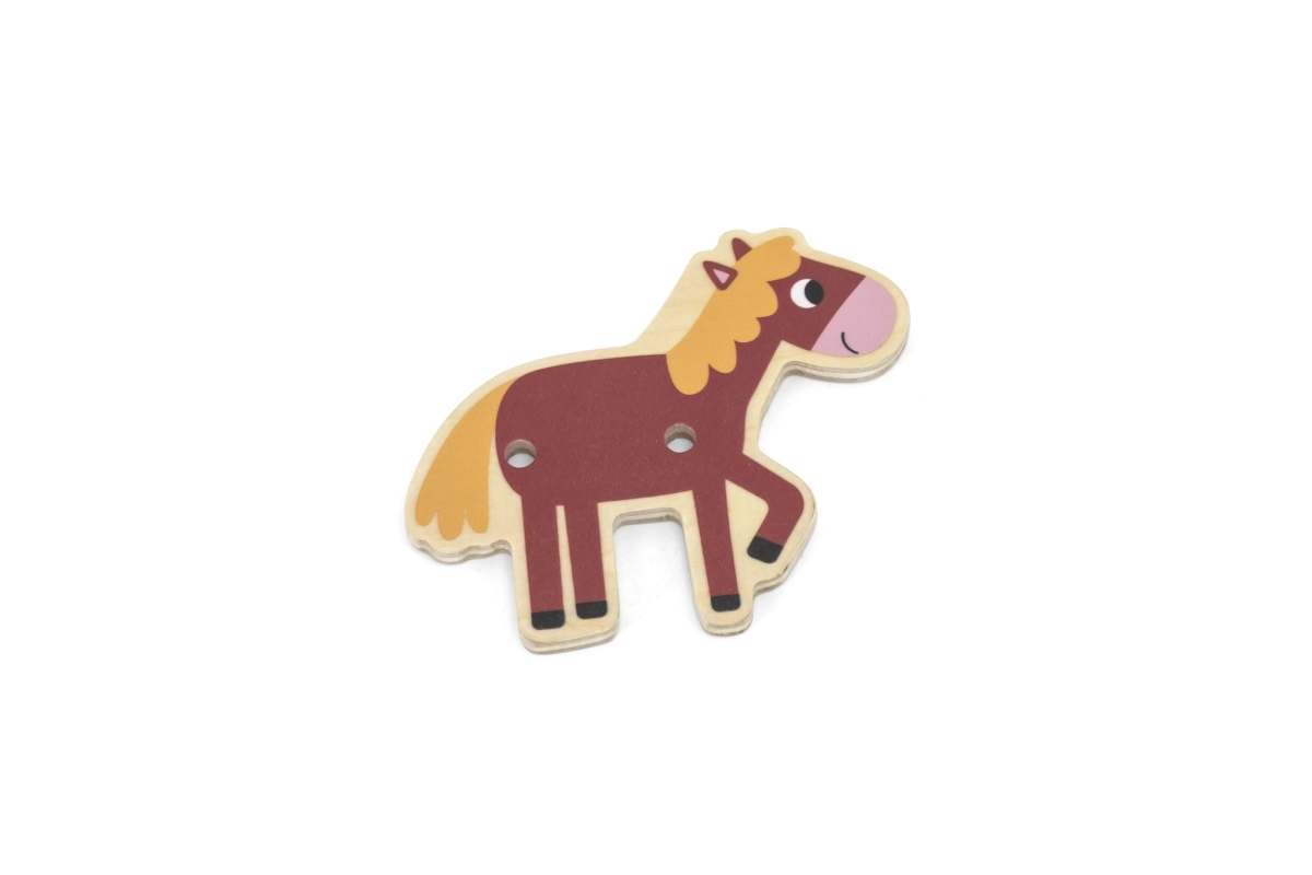 Ce set d’enfilage sur le thème de la ferme est un outil idéal pour développer les compétences des enfants d’âge préscolaire. En passant les cordons à travers les pièces en bois colorées selon les modèles ou leur propre imagination, ils renforcent leurs doigts, améliorent leur prise en main et se préparent à l’écriture et au dessin.