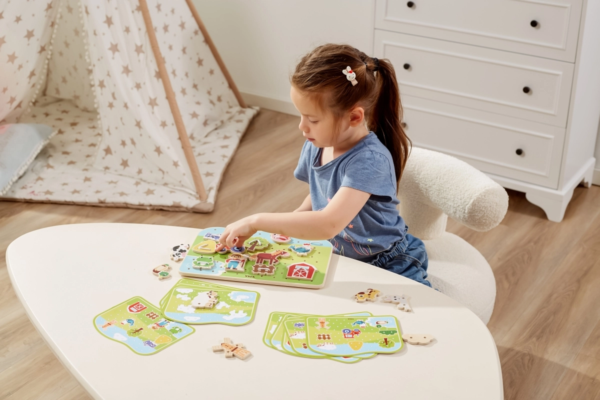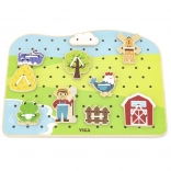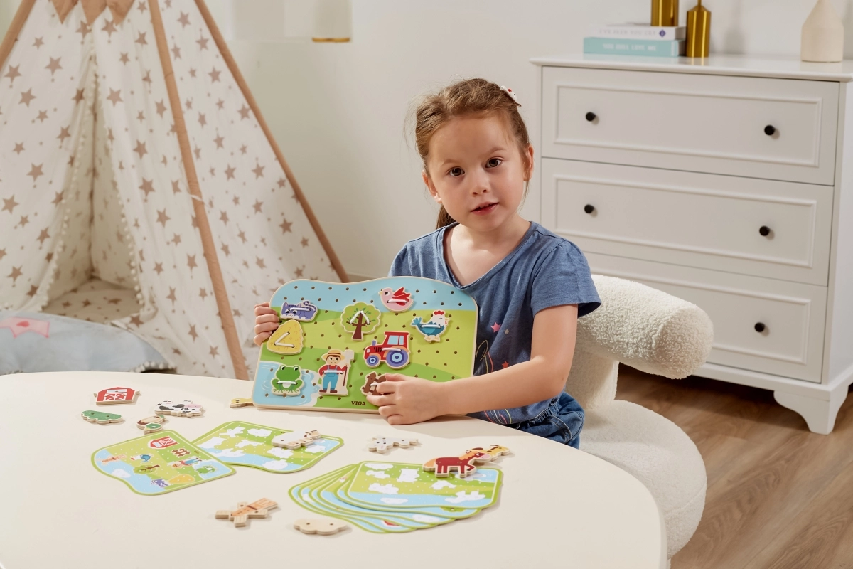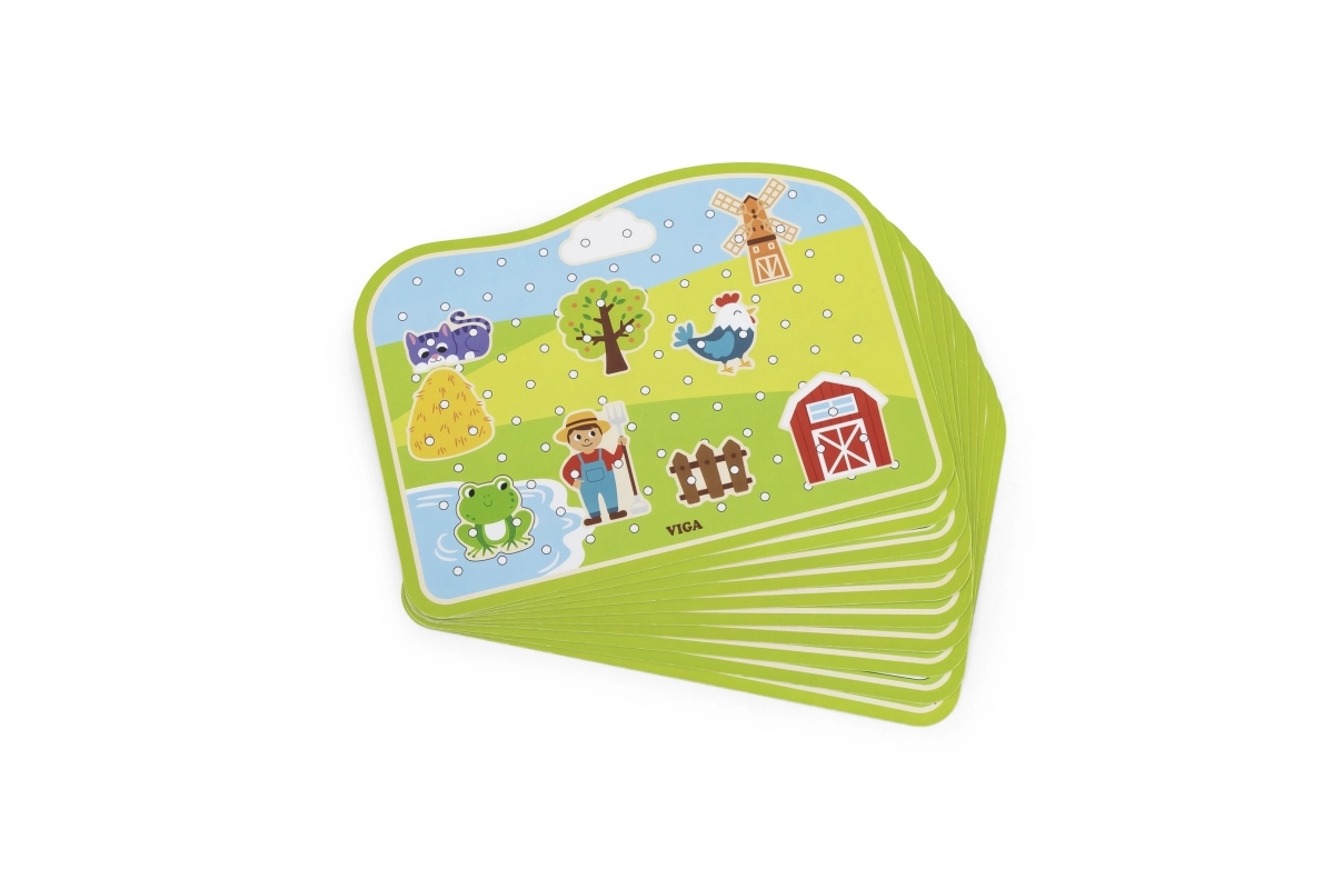 Découvrez un jeu ludique et éducatif pour les tout-petits : un ensemble d’enfilage en bois sur le thème de la ferme de VIGA. En enfilant les cordons, les enfants entraînent leur motricité fine, leur précision et la coordination œil-main. Une fabrication en bois de qualité et des peintures non toxiques garantissent un jeu sûr, plein de créativité et de joie.
