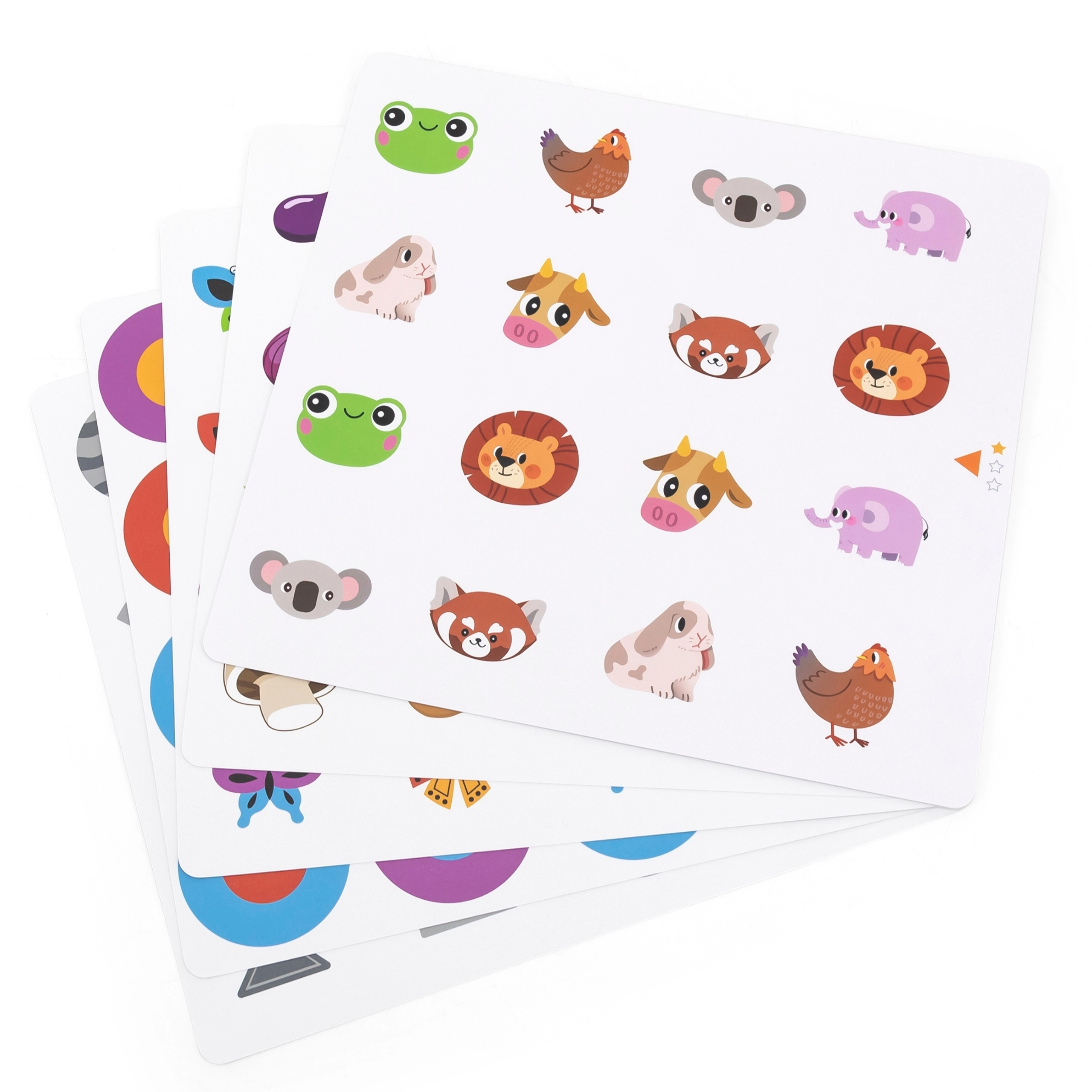 Inclut 10 cartes recto verso aux motifs variés (animaux, objets, plantes). Il suffit de les changer pour adapter les thèmes et la difficulté à l’âge de l’enfant.