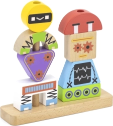 Découvrez un jouet évolutif qui grandit avec les enfants. Les pièces en bois de formes et couleurs variées se glissent facilement sur les chevilles de la base et permettent d’assembler différentes figures de robots. Les cartes modèles incluses guident des combinaisons simples aux plus complexes et développent la concentration ainsi que la patience.