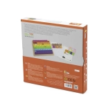 1 plateau/tableau en bois, 100 blocs en 10 couleurs, 8 blocs cylindriques avec signes, 2 grandes cartes en papier, 13 petites fiches, sac en toile, feutre