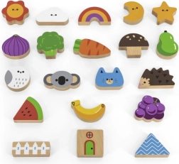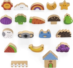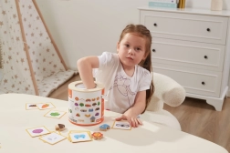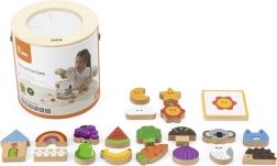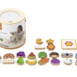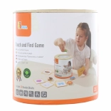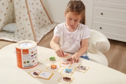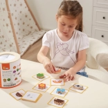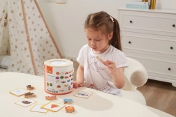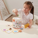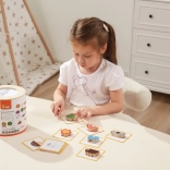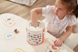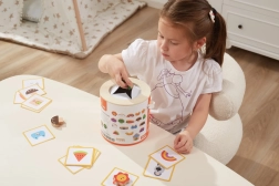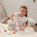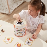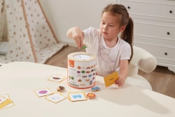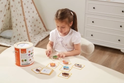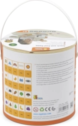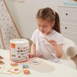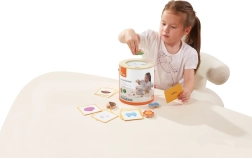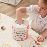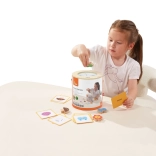 Jeu Attrape et trouve. L’ensemble comprend 20 dés, un seau en carton, 20 cartes de jeu et un couvercle. Dimensions de l’emballage env. 16 × 15,5 cm. Âge 3+
