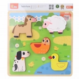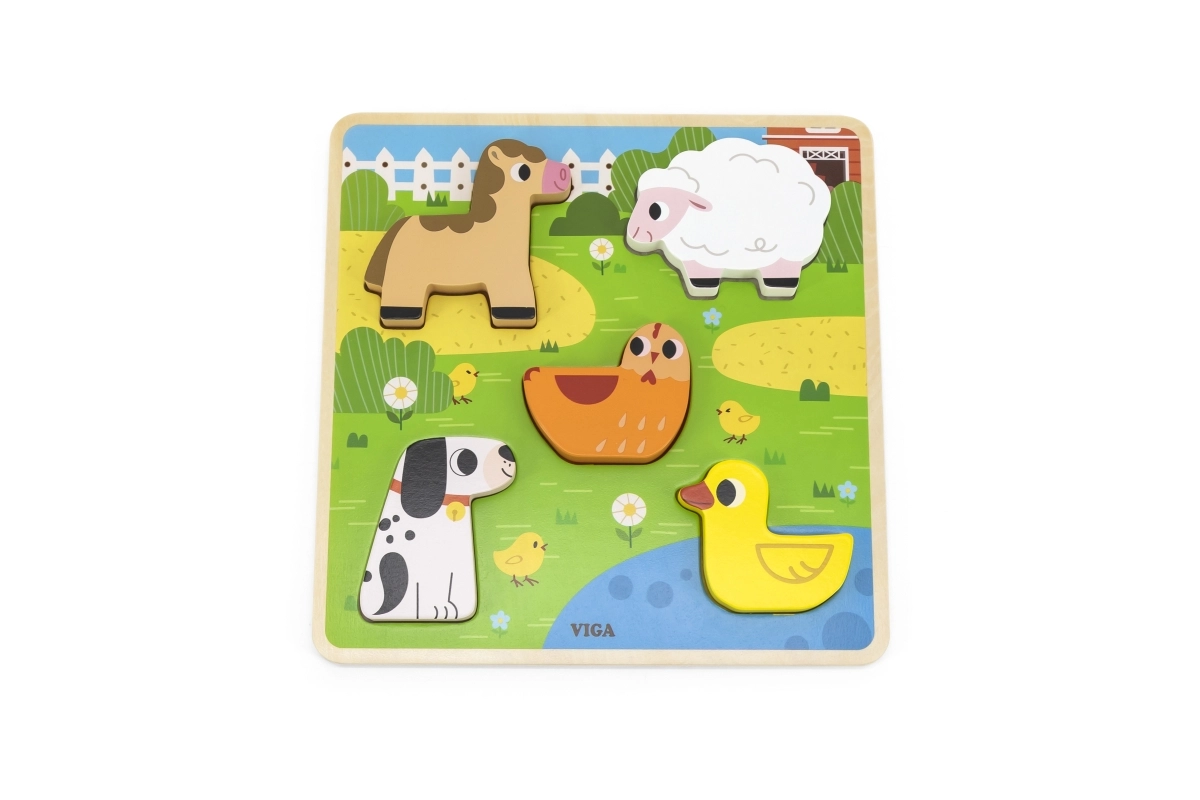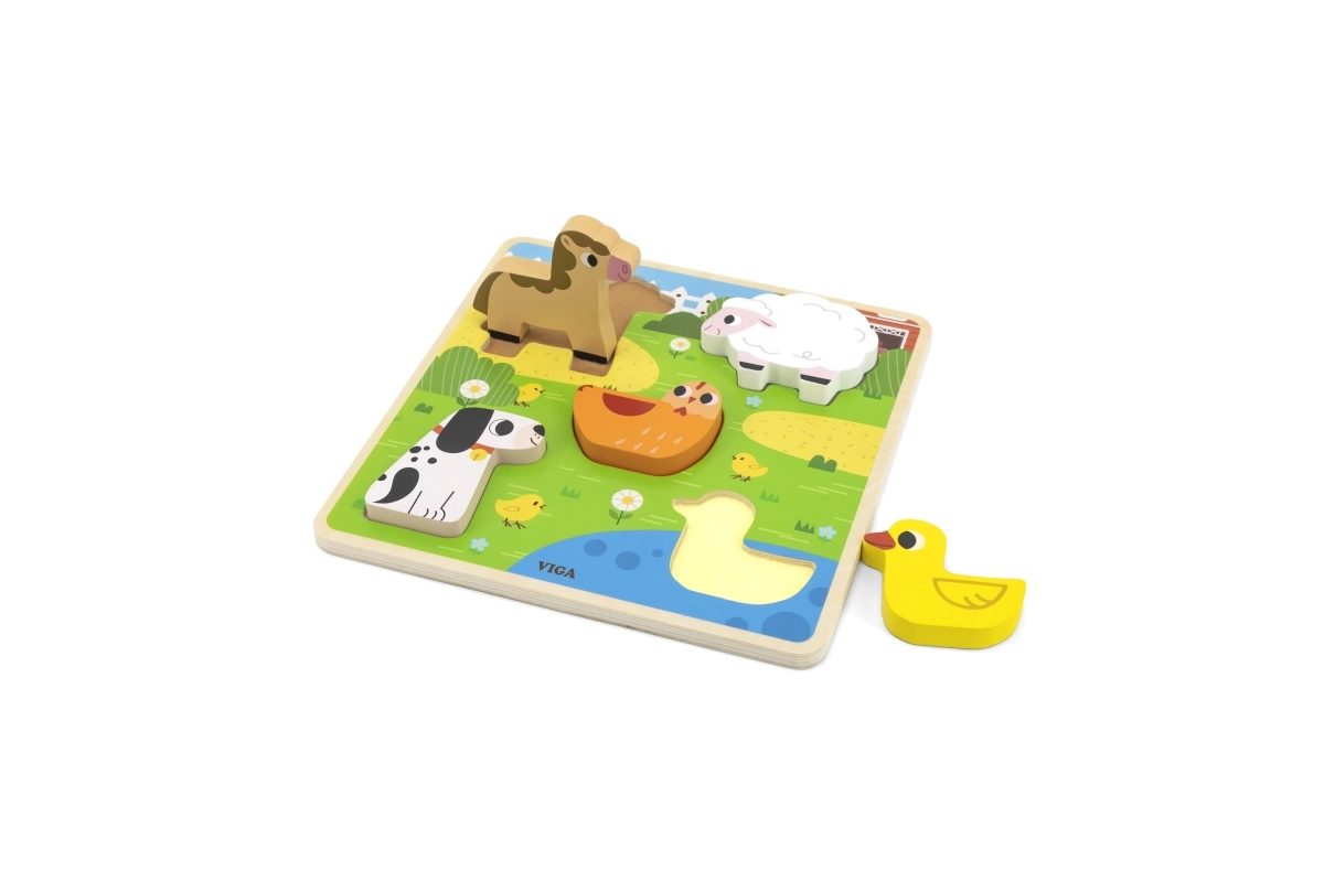Ce joli puzzle en bois sur le thème de la ferme comprend 5 pièces robustes – un cheval, un mouton, une poule, un chien et un canard. Les enfants placent les animaux dans les ouvertures correspondantes sur la base colorée, entraînant ainsi la reconnaissance des formes et la mémoire visuelle.