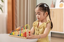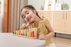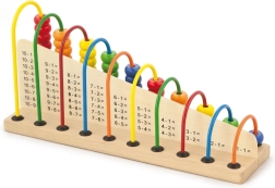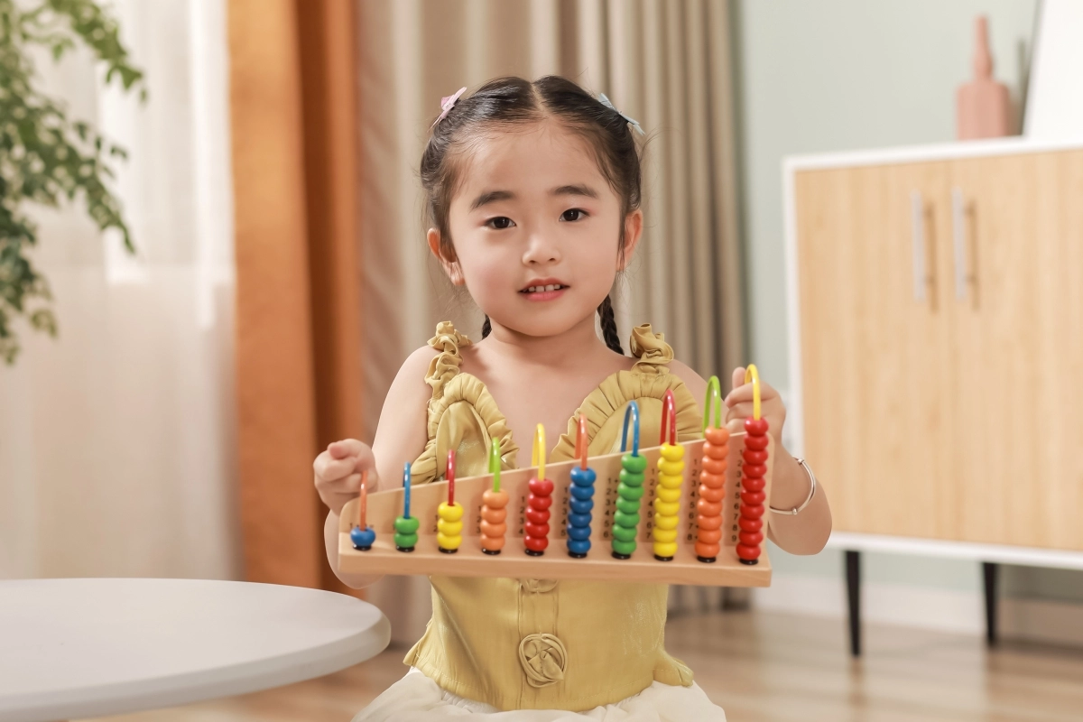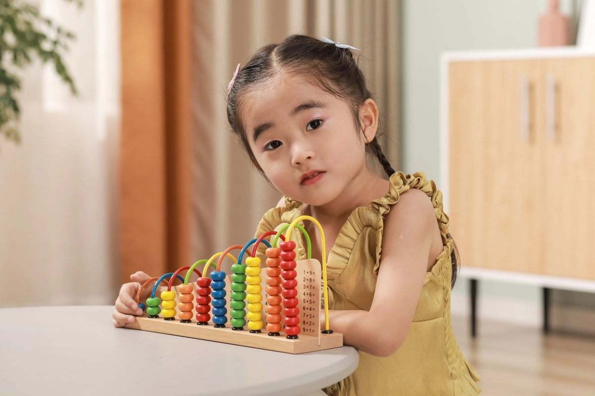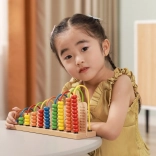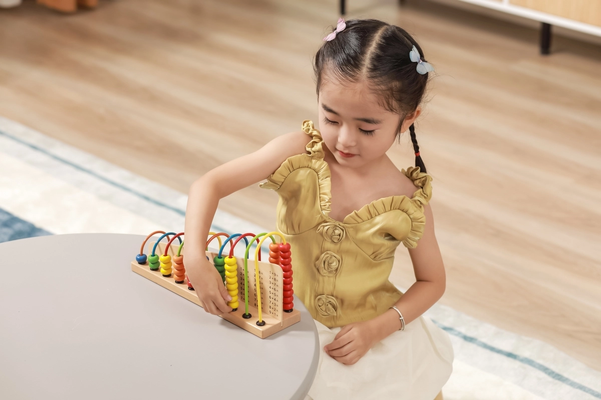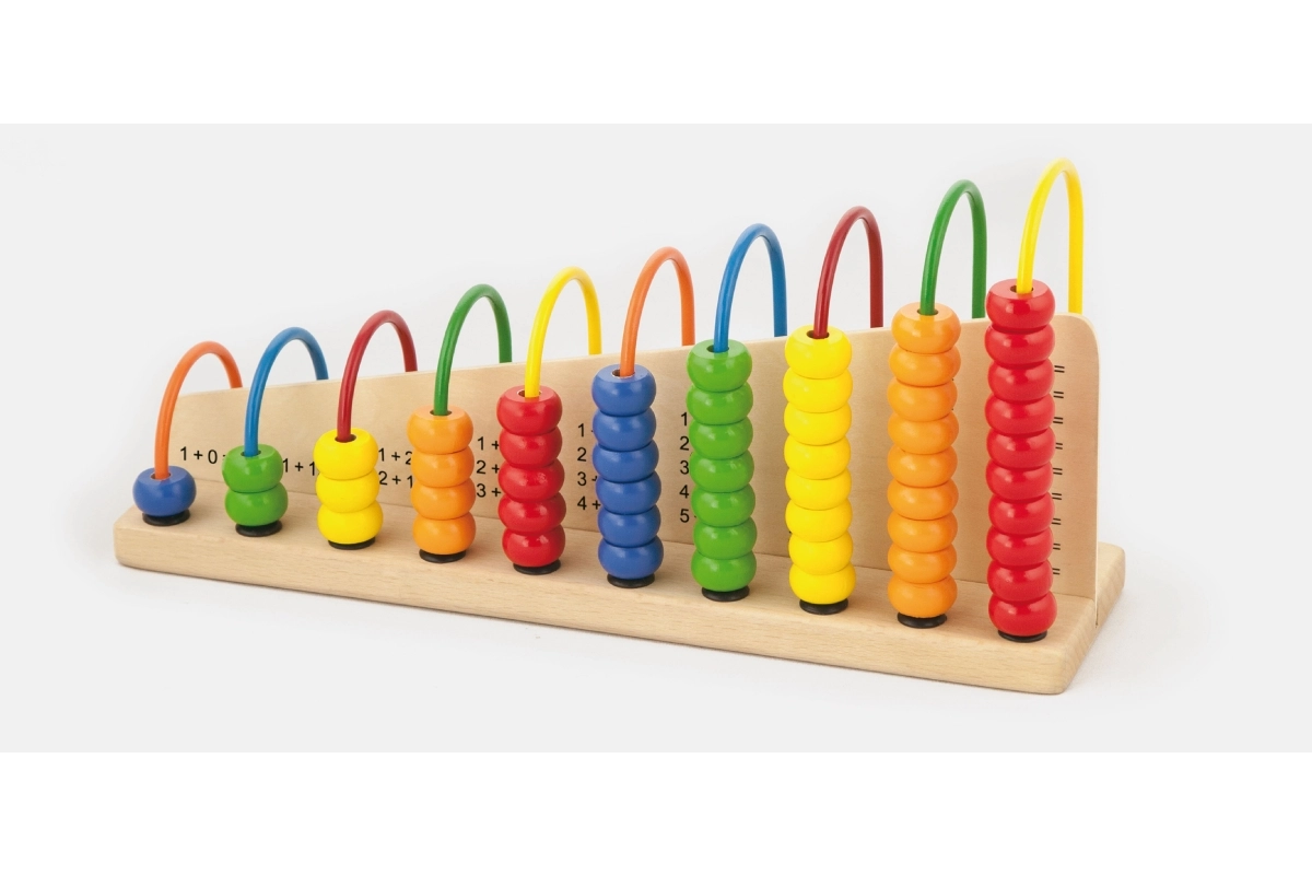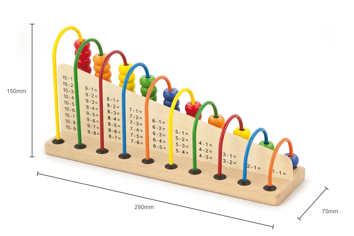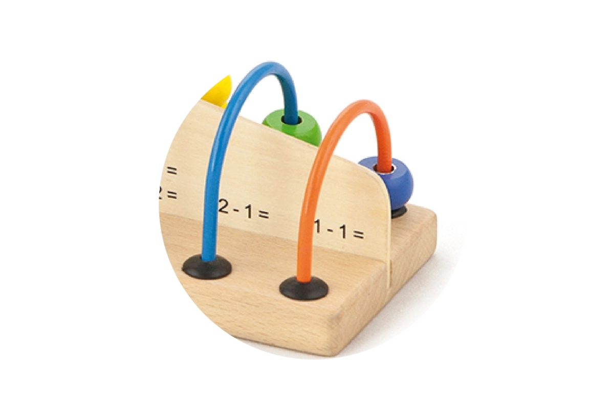Des exercices simples sont imprimés sur le socle. L’enfant déplace les perles et associe le bon nombre – un entraînement visuel et amusant à l’addition et à la soustraction.