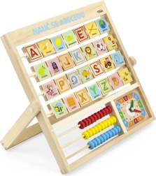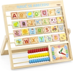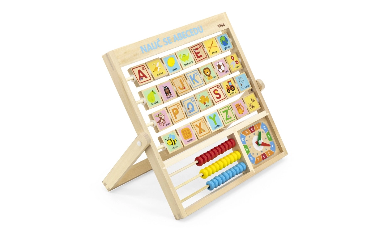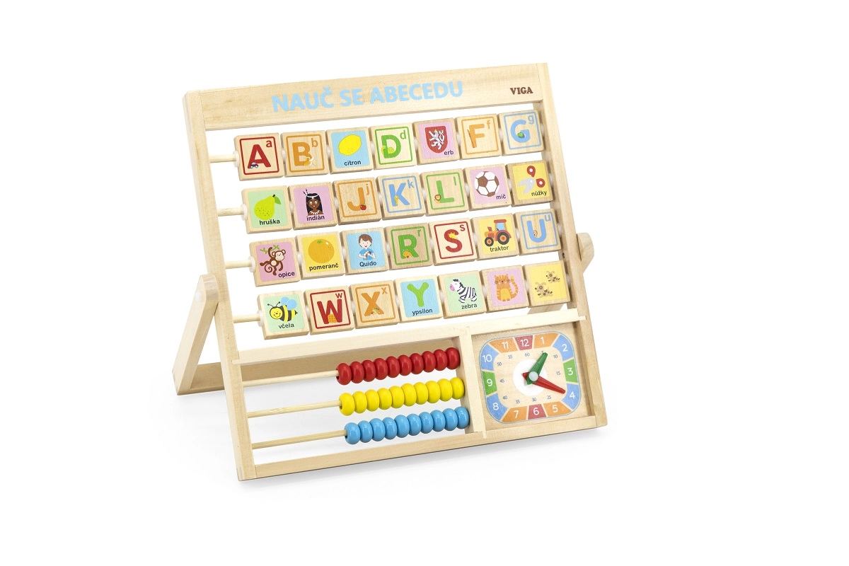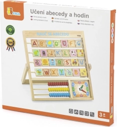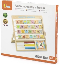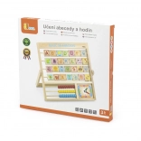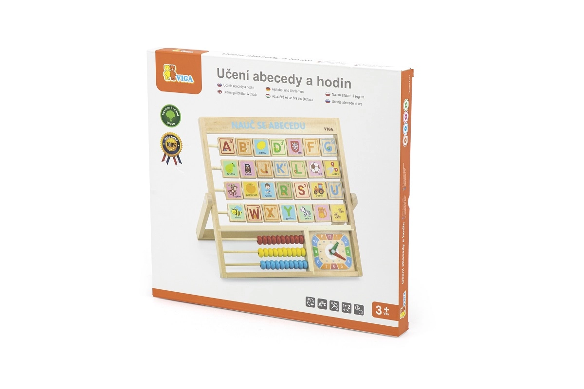 Alphabet et horloge en bois en langue tchèque. Les enfants peuvent apprendre les lettres, les chiffres et se faire une idée générale de la lecture de l’heure. Chaque lettre a un mot au verso pour une meilleure mémorisation. Dimensions env. 32,5 × 32 × 2,3 cm. Dimensions de l’emballage env. 34 × 32,5 × 3 cm. Âge 3+