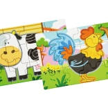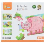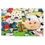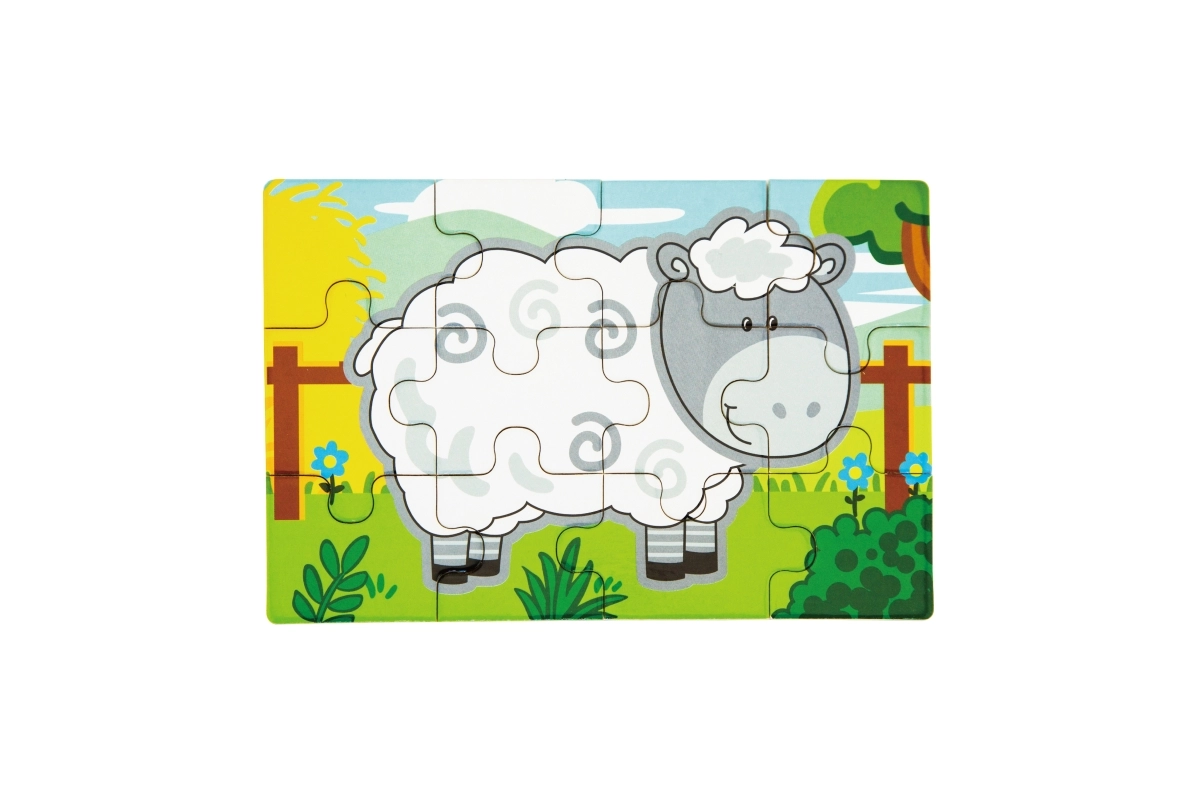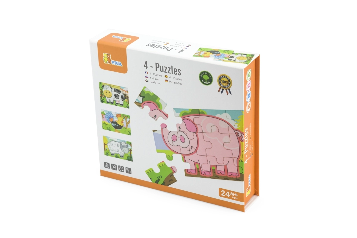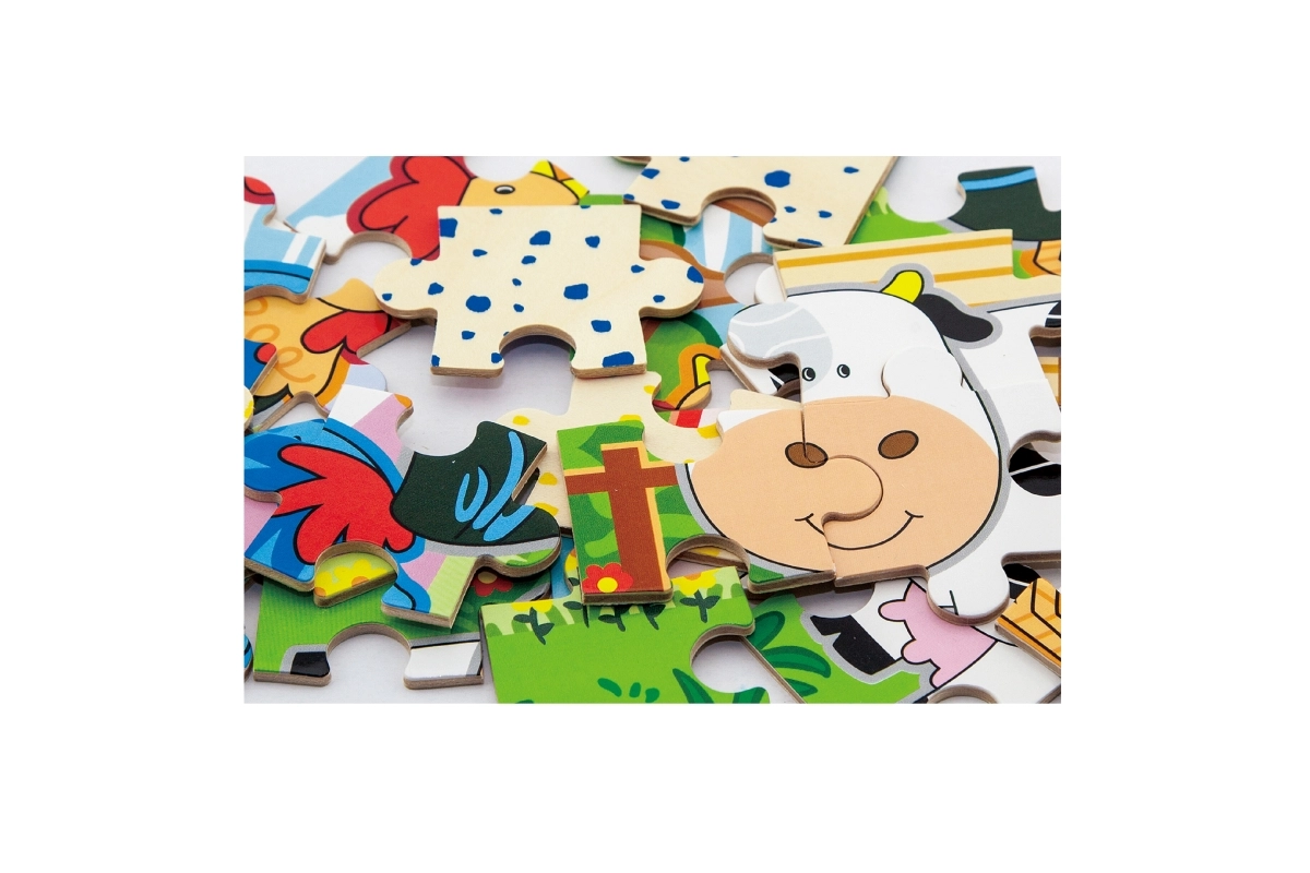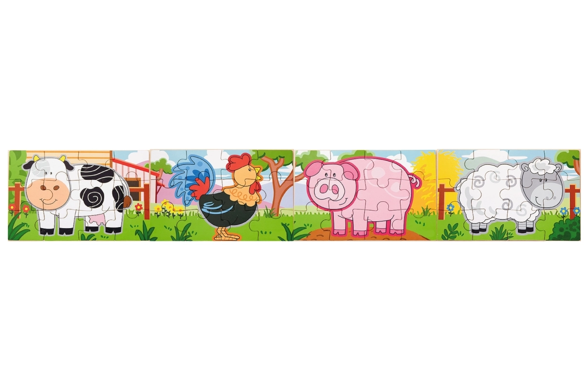 Puzzle en bois sur le thème de la ferme. L’emballage contient 4 images au total (48 pièces au total). À partir des puzzles, on peut assembler une longue image représentant les 4 animaux. Dimensions de l’emballage env. 20,5 x 19,5 x 4,5 cm. Âge 24 mois et plus.