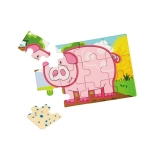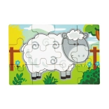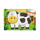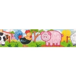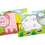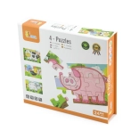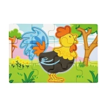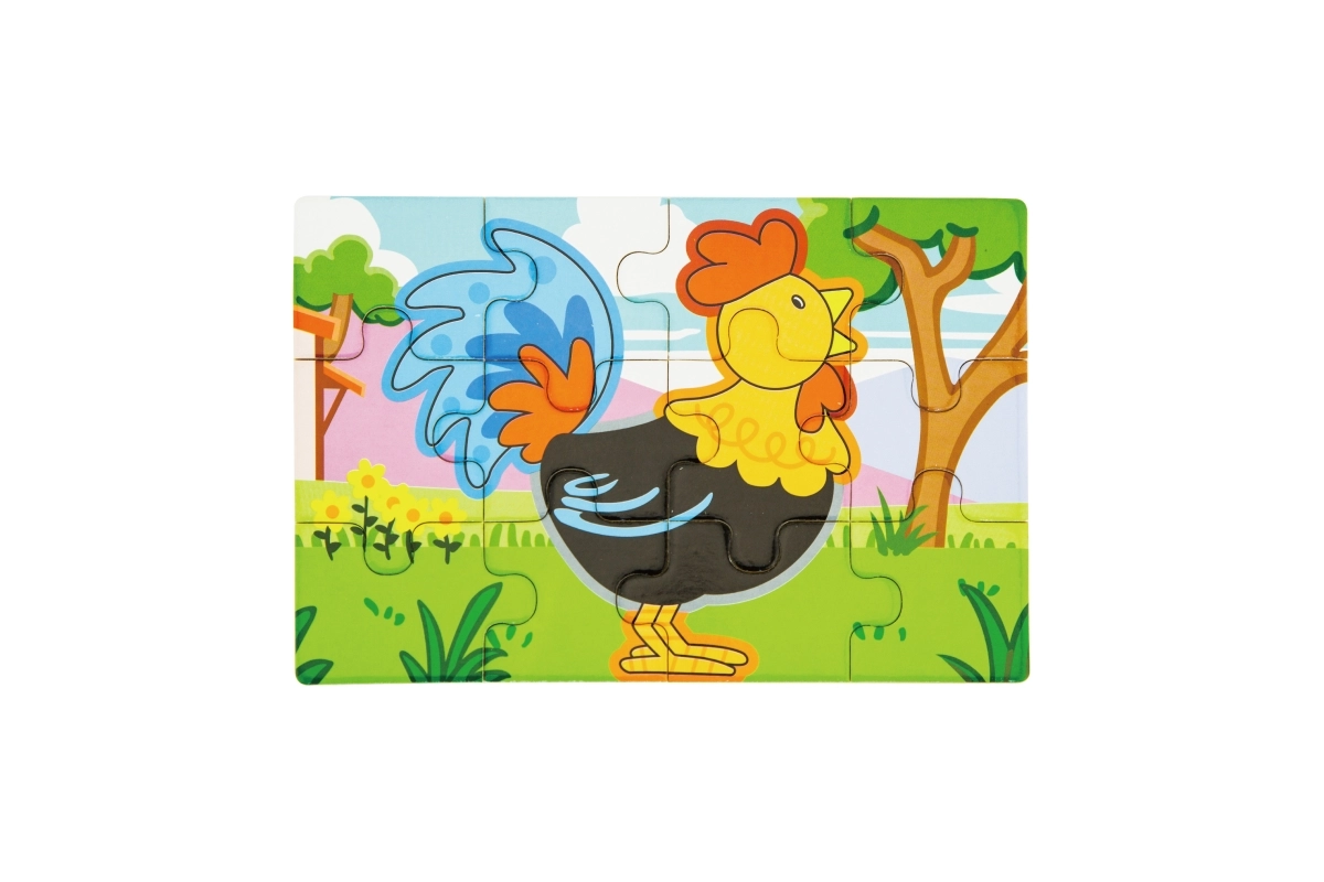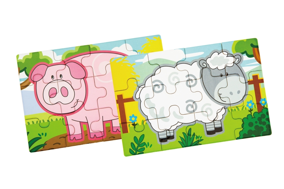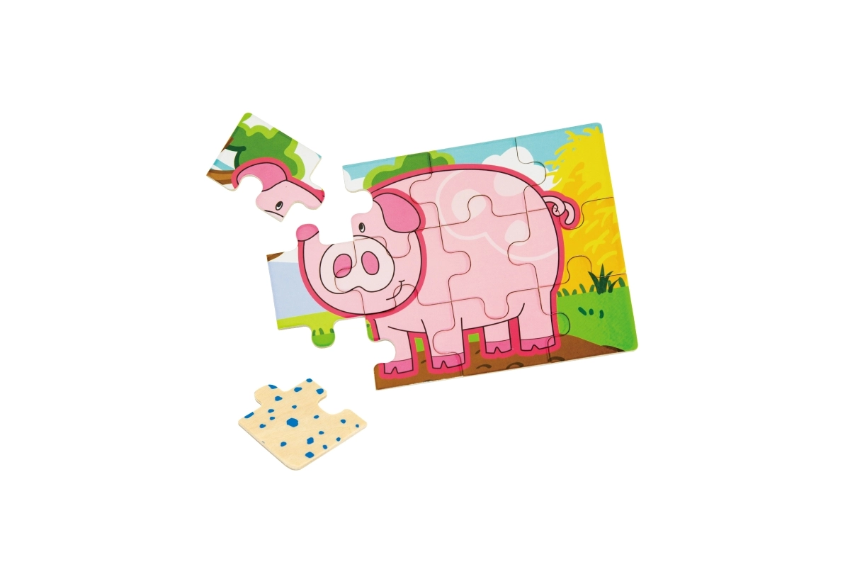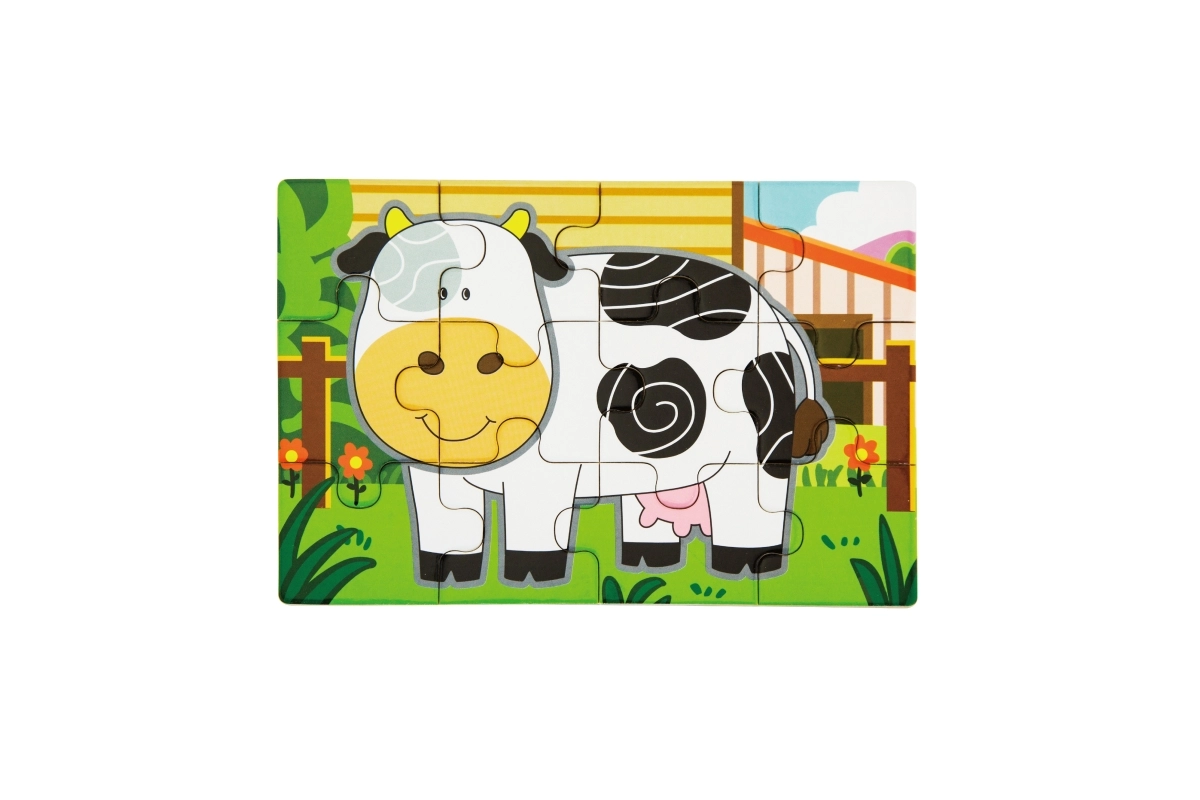 Puzzle en bois sur le thème de la ferme. L’emballage contient 4 images au total (48 pièces au total). À partir des puzzles, on peut assembler une longue image représentant les 4 animaux. Dimensions de l’emballage env. 20,5 x 19,5 x 4,5 cm. Âge 24 mois et plus.