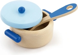Élégant set de cuisine en bois en version bleue pour de petits chefs à partir de 24 mois. Comprend une casserole avec couvercle, une poêle avec œuf, une manique et d’autres accessoires pour un jeu de cuisine réaliste. Bois de qualité, bords lisses et conception sûre favorisent la créativité, la motricité fine et le jeu de rôle amusant.