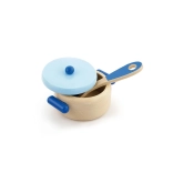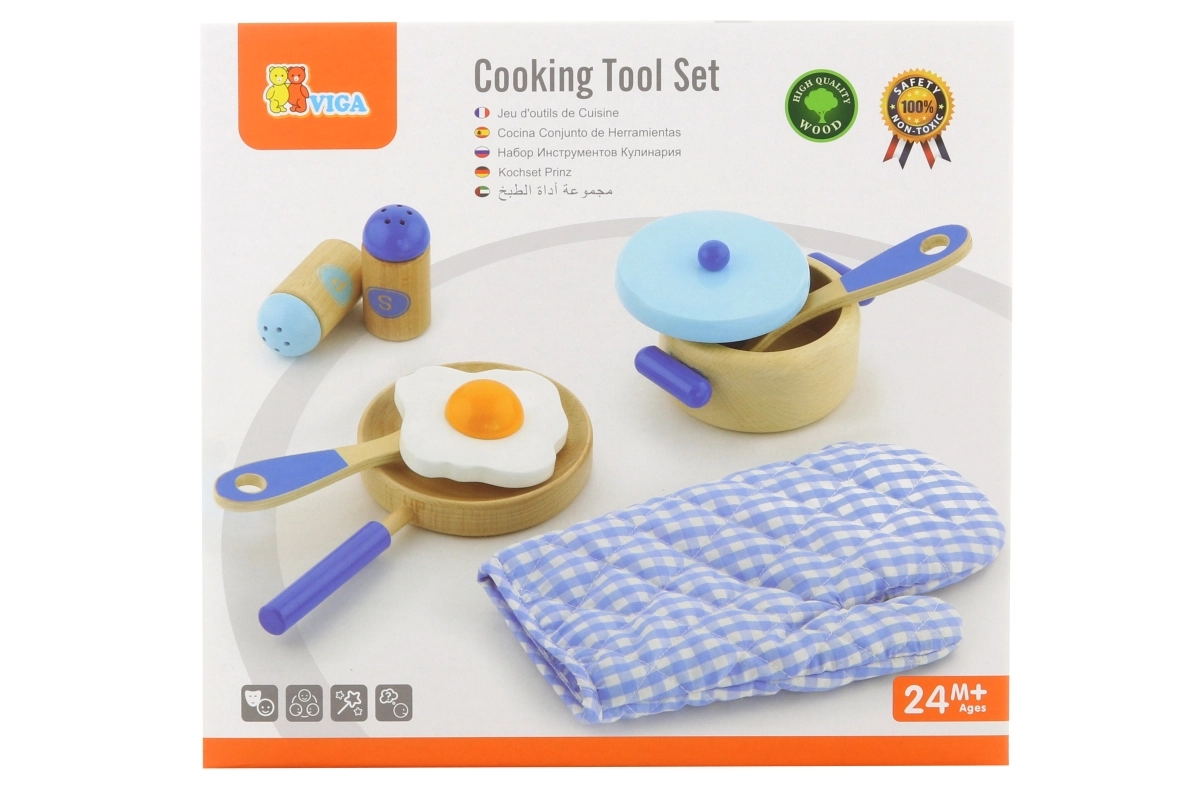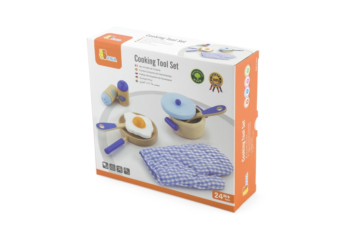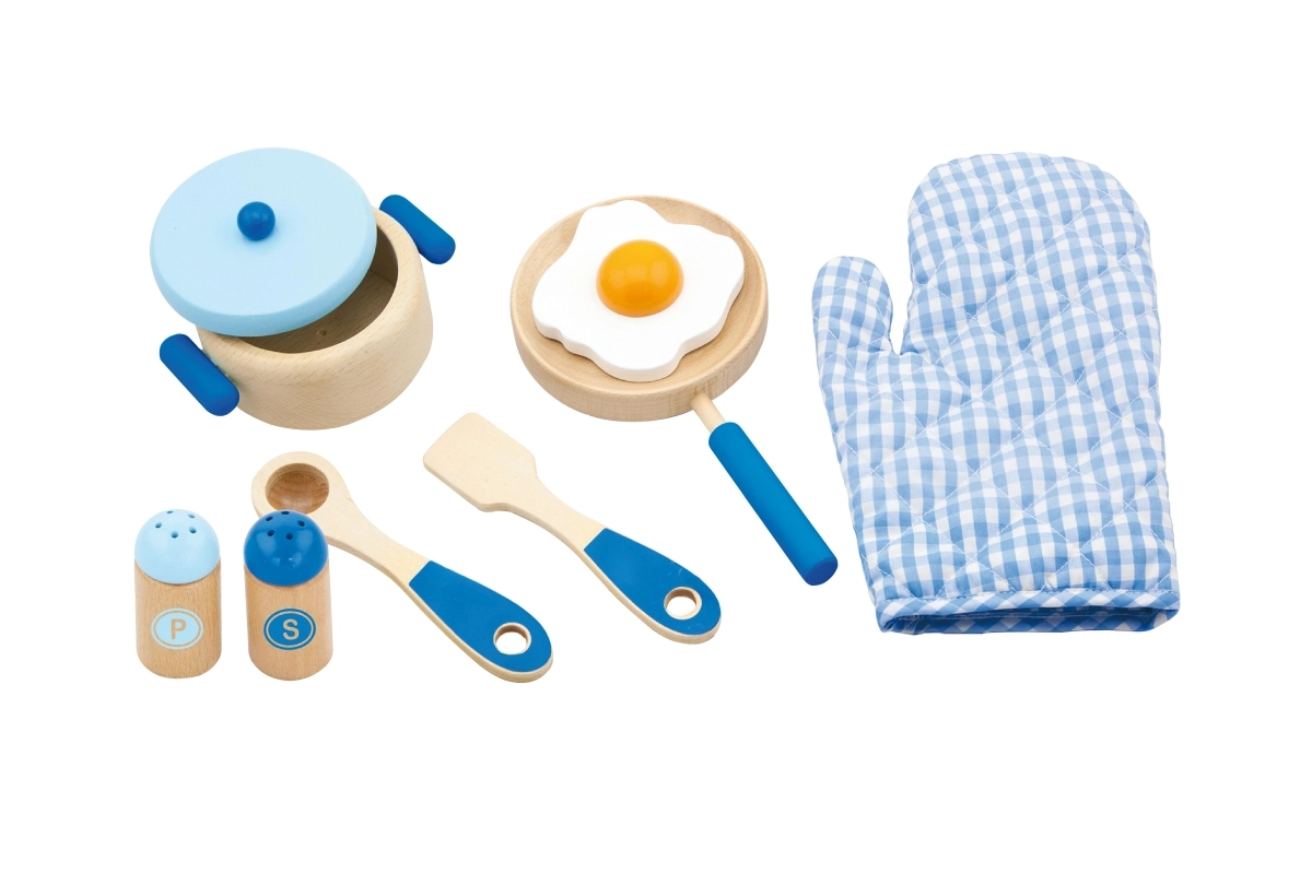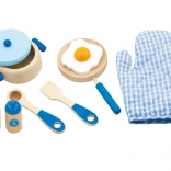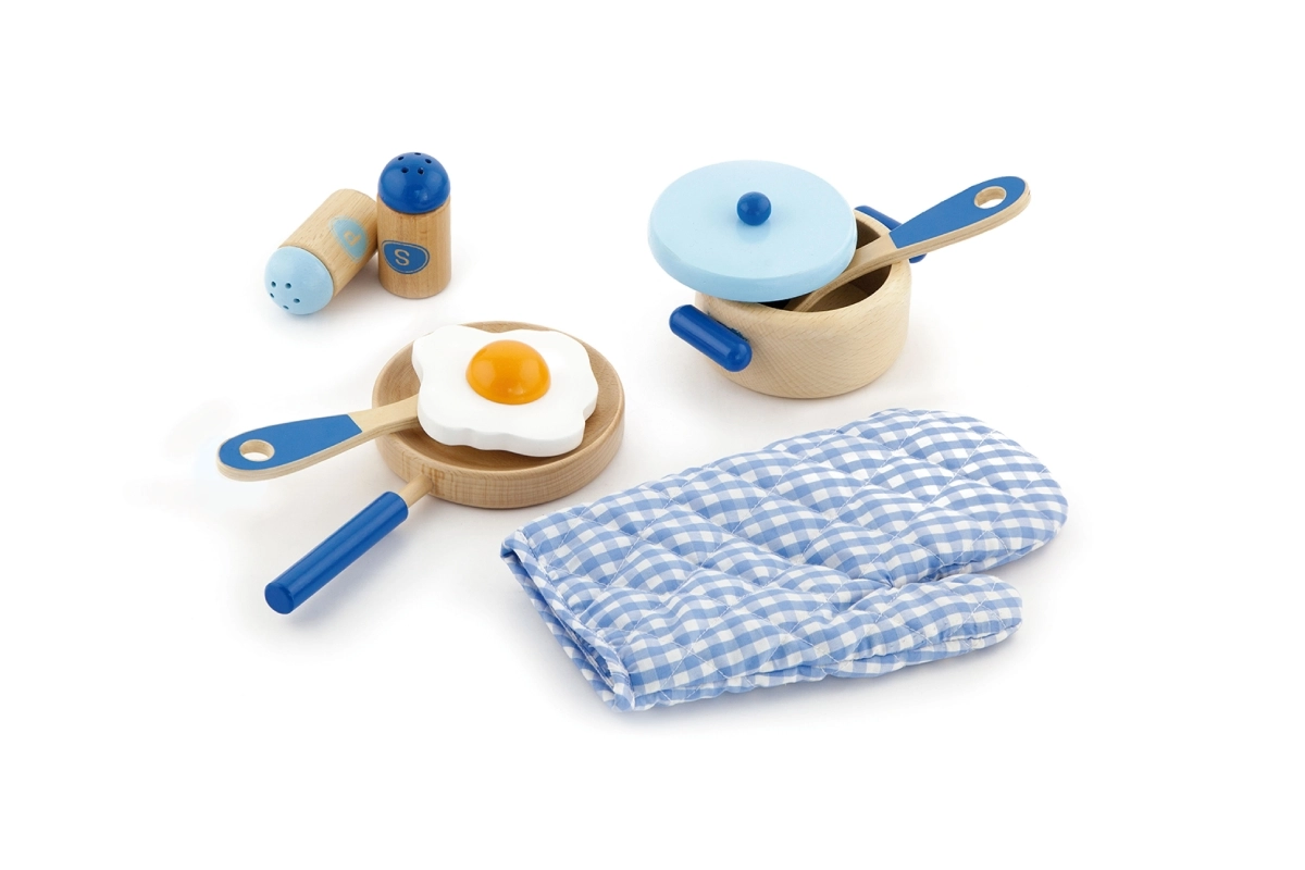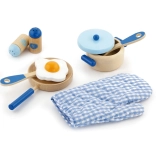 Équipement complet pour jouer à cuisiner : casserole avec couvercle, poêle avec œuf, cuillère, salière, poivrière et manique en tissu. Idéal pour les premières aventures culinaires.