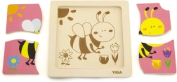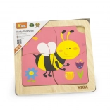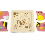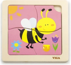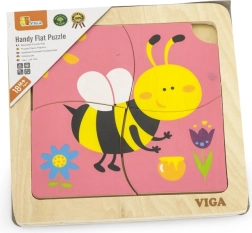 Le puzzle comprend 4 pièces avec un motif d'abeille, qui s'assemblent en une image sur la plaque de base.