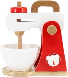 Le mixeur arbore un design rouge et blanc ainsi que des éléments en bois, ce qui en fait une copie réaliste d'un véritable appareil de cuisine.