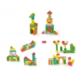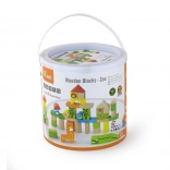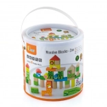 Ensemble coloré de blocs en bois à thème zoo pour les enfants dès 2 ans. Le seau contient 50 pièces et une brochure illustrée avec des plans de construction en trois niveaux. Favorise la créativité, la motricité fine et la représentation spatiale, avec en plus un emballage pratique en seau pour un rangement facile.