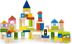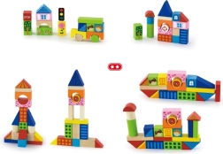 L'ensemble comprend des blocs de différentes tailles, de 2,5 cm à 7,5 cm, permettant aux enfants de créer différentes constructions telles que des maisons, des ponts et d'autres éléments urbains. Grâce au matériau de bois durable, les blocs conviennent pour le jeu sûr et à long terme.