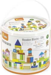 Cette construction en bois comprend 75 blocs colorés variés pour construire des scènes urbaines. L'emballage comprend également une brochure illustrée avec des instructions pour inspirer les enfants à construire de manière créative. Tout est rangé dans un seau pratique avec une poignée mesurant environ 22,5 x 20 cm.