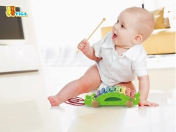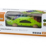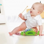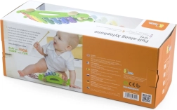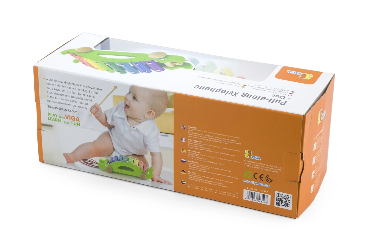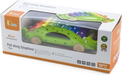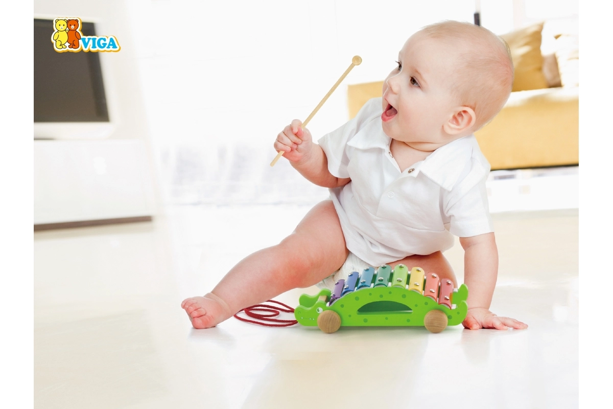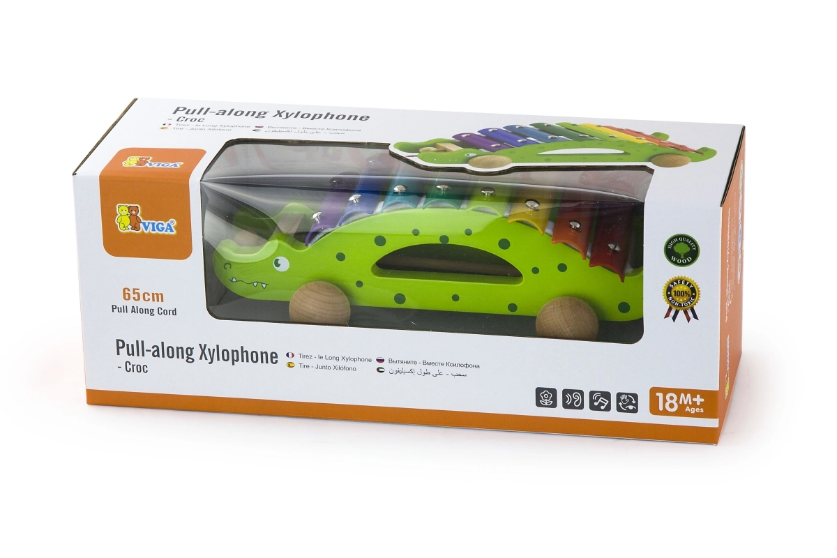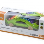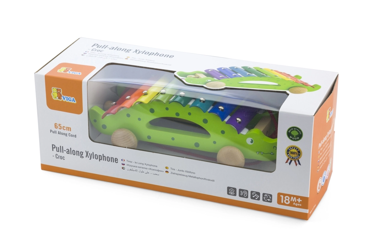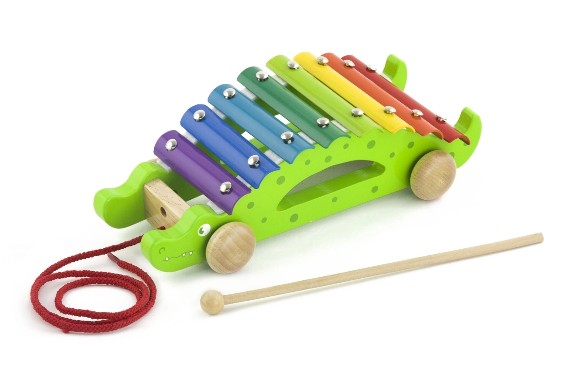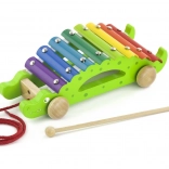 Les lames colorées du xylophone invitent à explorer les sons et à apprendre le rythme, tandis que le crocodile roule sur ses roues derrière l’enfant.